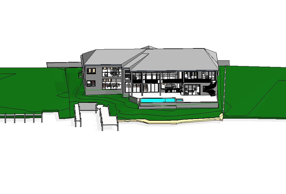 modern home with light colored walls lower level of walls have coral colored stone facade roof is light colored metal foreground is turquois bay that goes up to lawn background is lush tropical hardwood and palm trees