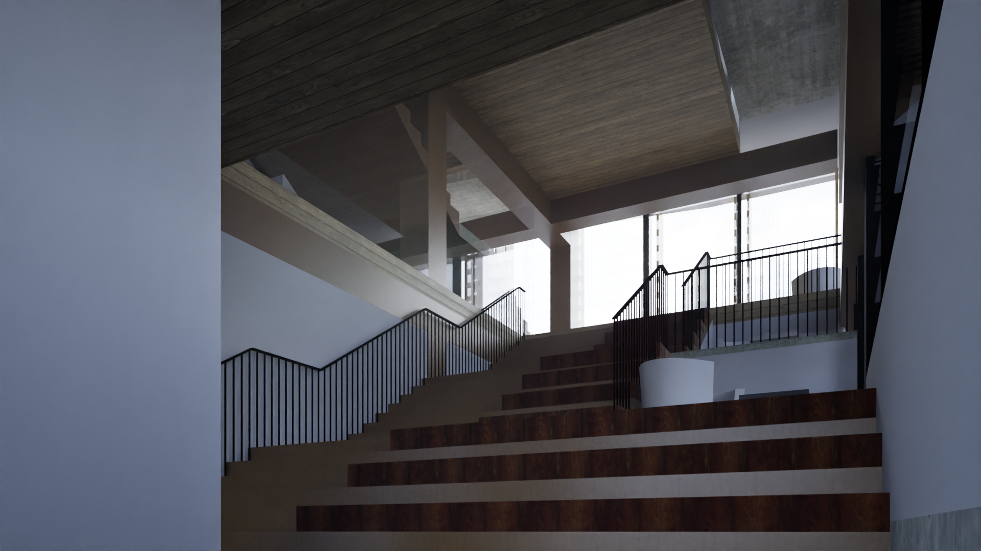 replace all white surfaces with a matte oak mass timber texture natural light oak tone with subtle grain appearance similar to clt or glulam mass timber construction replace beam and column materials with timber matching the matte oak mass timber texture so the structural frame reads as exposed timber construction reduce the visual weight of the floor slab lines so they appear faint and subtle thin linework minimal contrast soft edges so the floors do not dominate the facade maintain a clean architectural appearance where the timber structure is the primary material expression replace the colour of the chairs to natural earthy blue replace the table texture to match the overall oak finish of the scene but keep the legs matte black ultra realistic architectural visualization soft daylight refined timber textures architectural rendering style high detail add a sexy office woman with a backpack walking up the stairs with motion blur