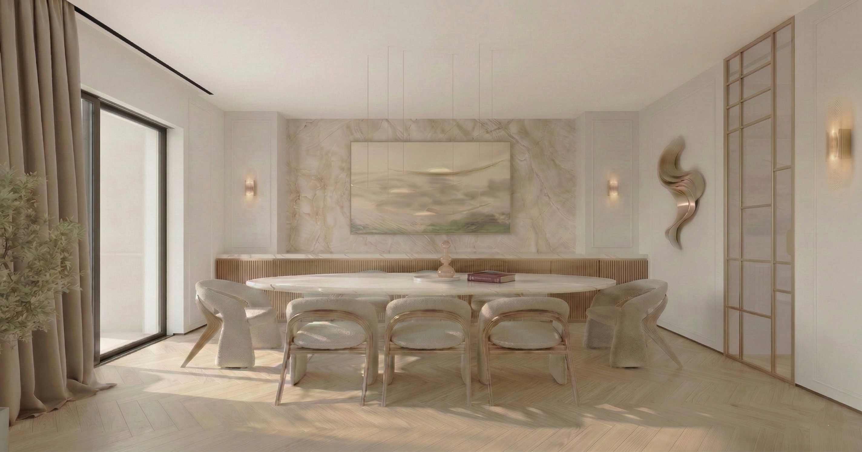 take this semi final render and enhance realism without altering any of the current image s geometry features or objects as well as image orientation no cropping zooming etc final result must be 4k do not add any new objects keep the herringbone pattern exactly as is but increase the tonal variation between individual planks each stave should have a distinct natural shade ranging from light sand to muted beige change the surface to an ultramatte raw timber texture with visible open grain removing all artificial sheen or plastic like smoothness the goal is to see a clear organic contrast in color from one tile to the next emphasizing its wooden nature yet making the effect visible yet delicate and so it doesnt stand out too much the goal is for the change from the original to be subtle as for the materials though its important to make them clear and visible we are aiming to respect the softness and elegance of the composition as a whole for that reason no exaggerated contrasts or saturations are welcomed here mind you the door was collaged into the composition which means you might need to slightly adjust the ceiling and flooring particularly the junction with the wall s finish recessed baseboard as well as the floor tiles near the door as a part of it is also part of the collage the goal is for the composition to look realistic result must be elegant clear yet soft with soft lighting too and no rough contrasts high res 4k for client viewing increase lighting contrast and sharpness slightly some chairs look dirty they shouldnt remember it must be elegant it must be realistic and neat