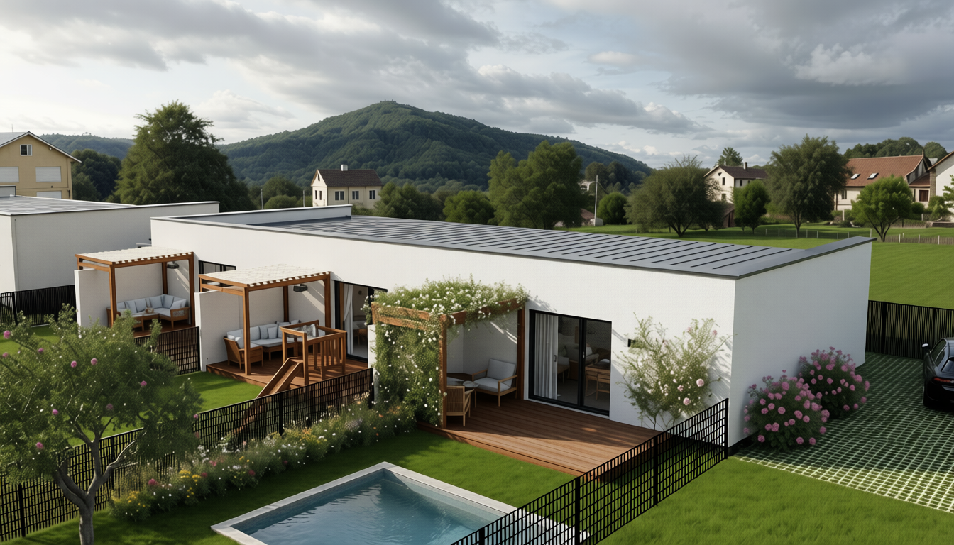 make a rendering of a modern bedroom in neutral colors a bed with pillows and duvets a white wardrobe with 5 smooth doors with black handles two doors of the wardrobe to be mirrored behind the bed to have white smooth paneling with black vertical lines
