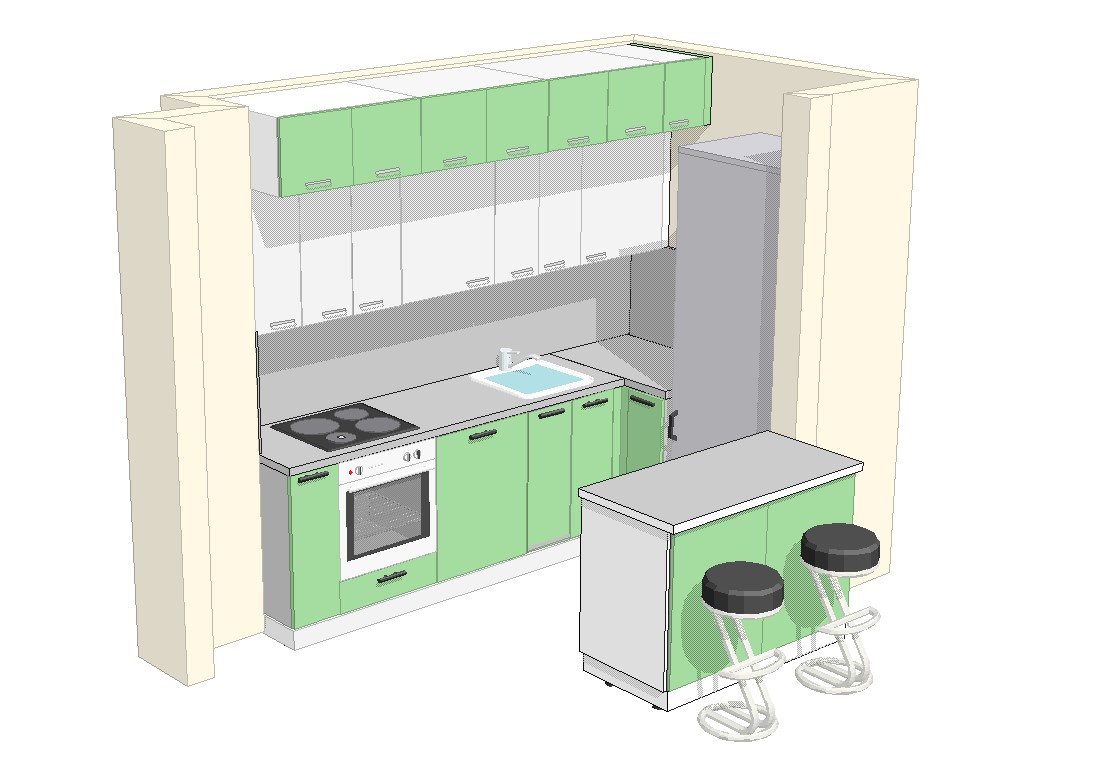 i want you to make a visualization of this drawing as well the kitchen base is white the bottom row is olive green the countertop and backsplash marble decor the top row is white the second top row is olive green matte mdf the black handle the black sink and the floor is gray wood laminate don t change anything just make the green a little lighter
