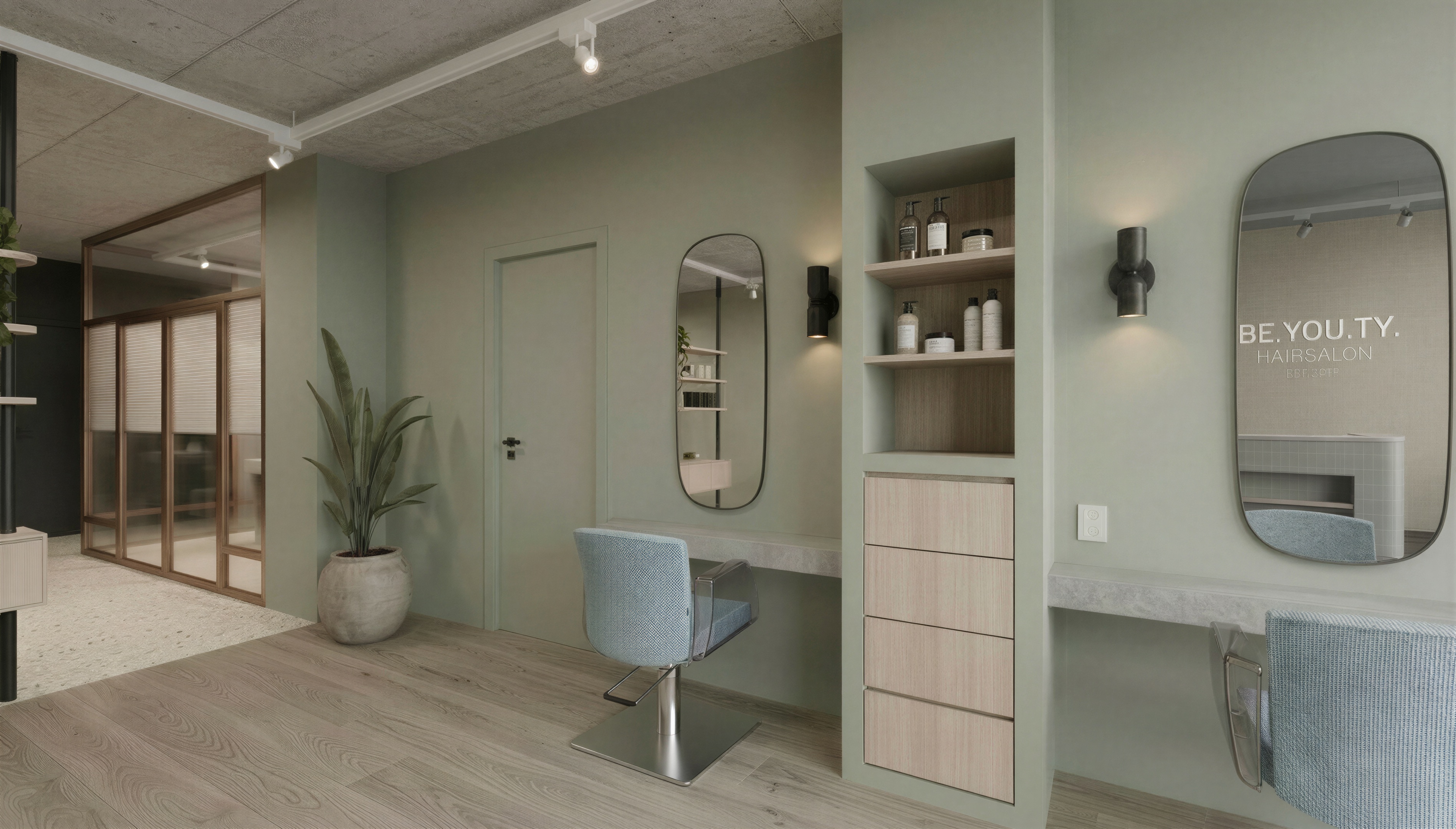 enhance the existing image with natural soft daylight streaming in from a window located on the right hand wall unseen next to the camera create realistic elongated shadows that follow the room s perspective stretching towards the back left add subtle light pools on the sage green walls and the wooden floor to enhance depth and liveliness maintain the exact furniture materials and layout soft global illumination cinematic interior lighting high end atmosphere architectural photography style do not change or add anything to the spot rails