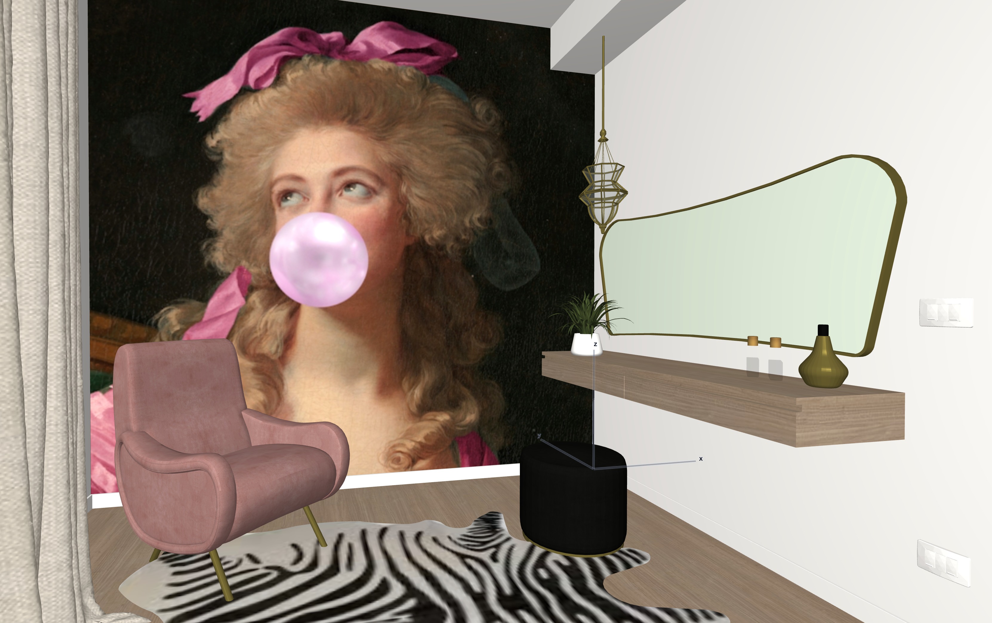 sopra allo scrittoio c uno specchio sopra alla pianta c una lampade accesa vintage il tappeto con il pelo la poltrona la lipsticks rosa di seletti
