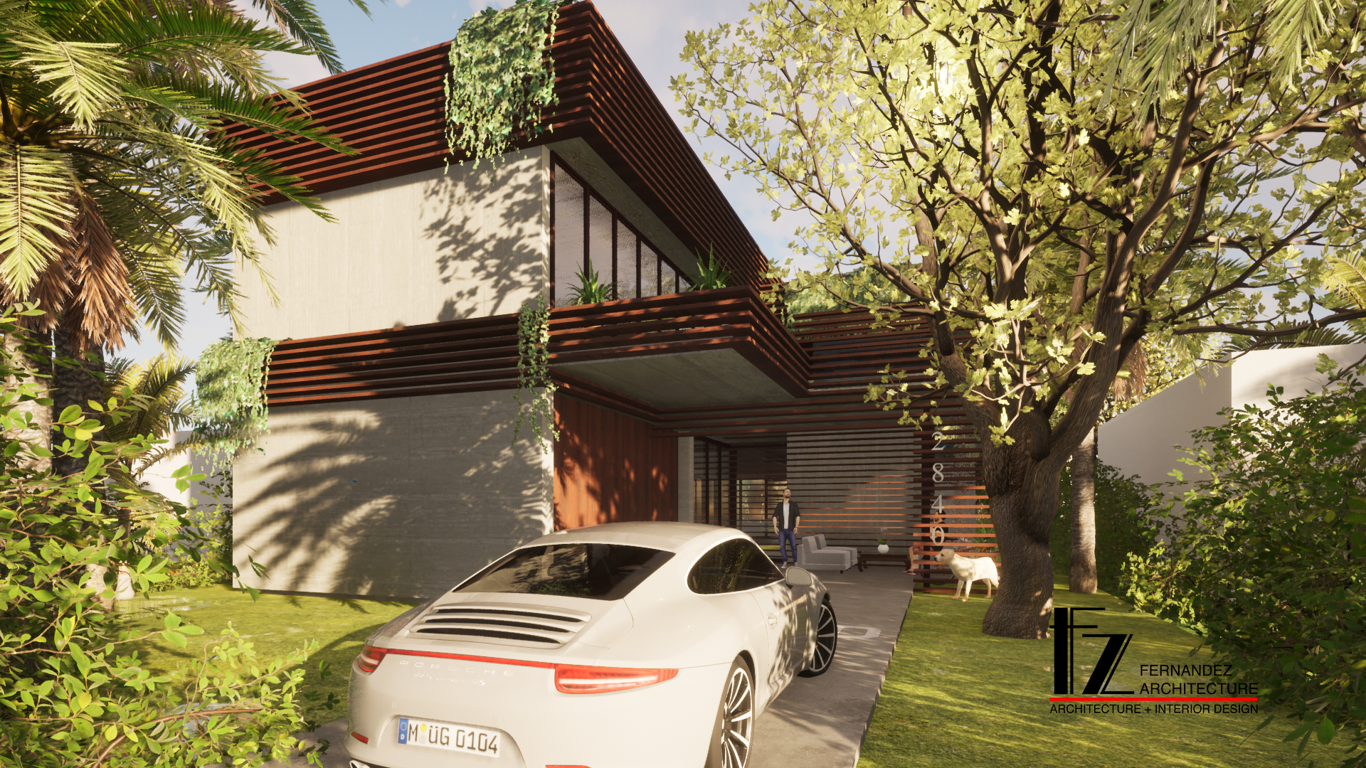 a modern elegant house surrounded by lush greenery and tall majestic trees the building features clean lines and large windows with a fa ade in soft beige and grey tones the sky above is a clear vibrant blue casting gentle sunlight and creating a warm inviting atmosphere in the foreground a well maintained lawn and neatly trimmed hedges are vivid green offering a crisp contrast to the building s muted palette a sleek blue car is parked in the driveway adding a touch of contemporary luxury the overall scene evokes a serene and upscale residential environment