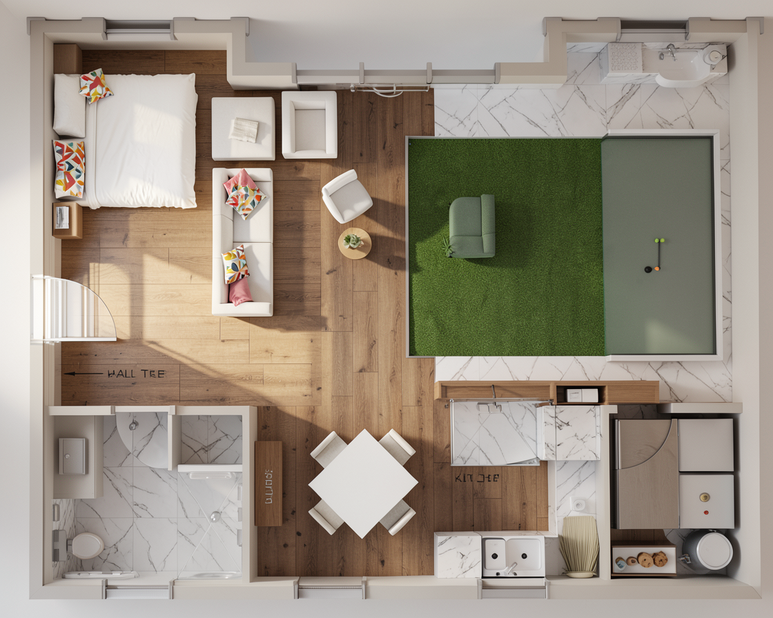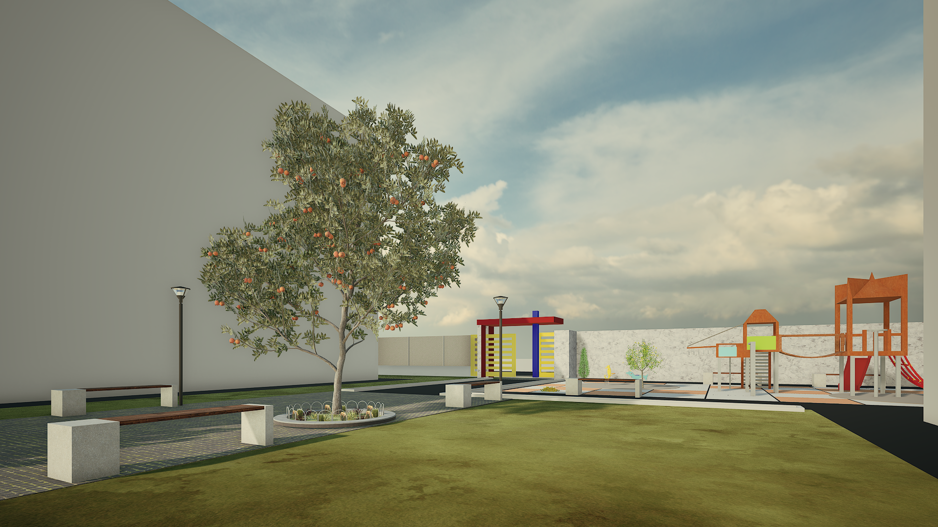 photorealistic exterior render of an urban park between buildings preserving original geometry and materials exactly warm golden hour lighting long soft shadows realistic reflections on windows detailed vegetation people interacting naturally benches and pathways global illumination pbr textures atmospheric perspective cinematic depth of field v ray style ultra realistic