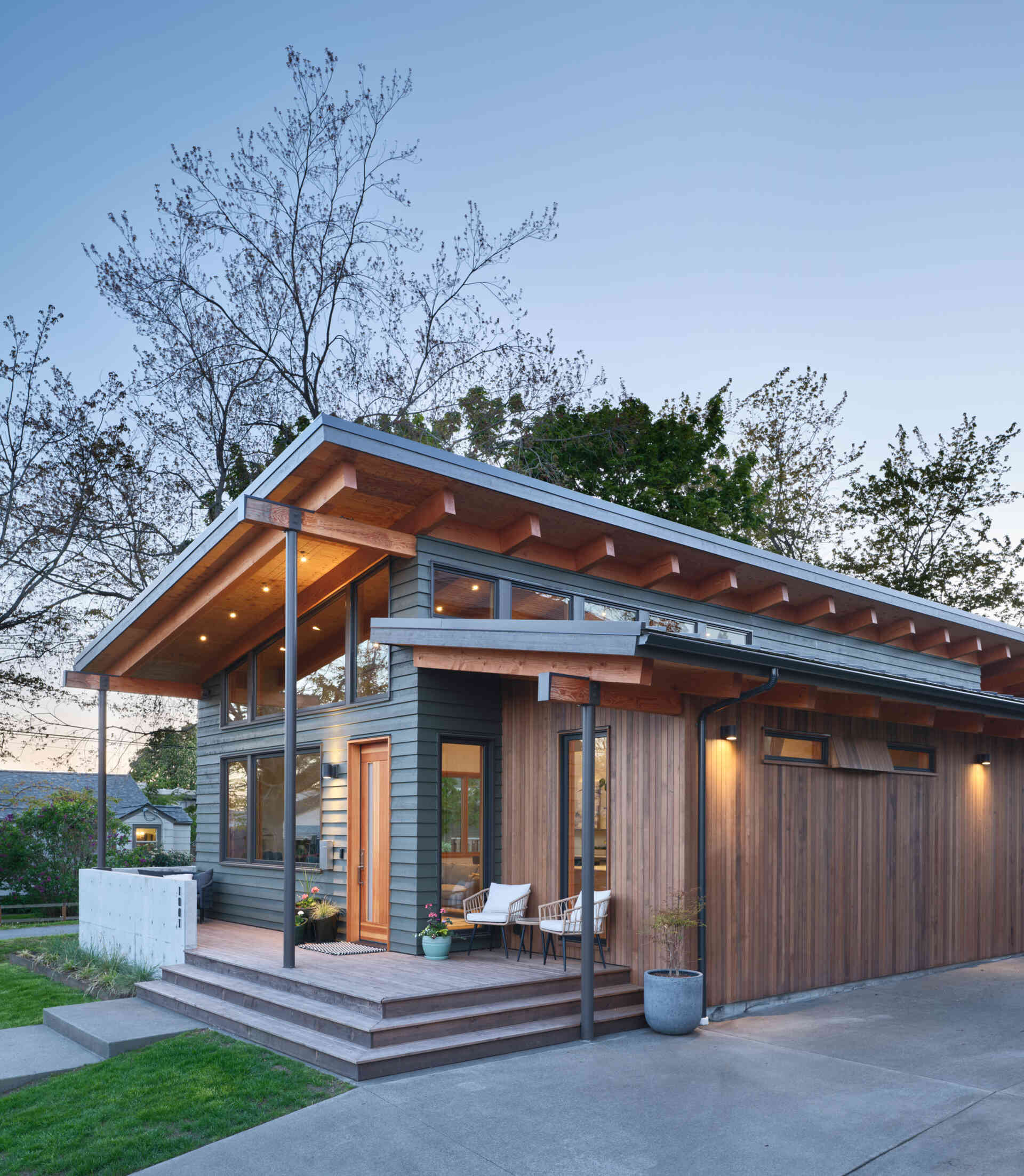 exterior shot keep original structure windows doors roofs and deck make nice wood deck and keep the original front deck shape create a northen california hills landscape