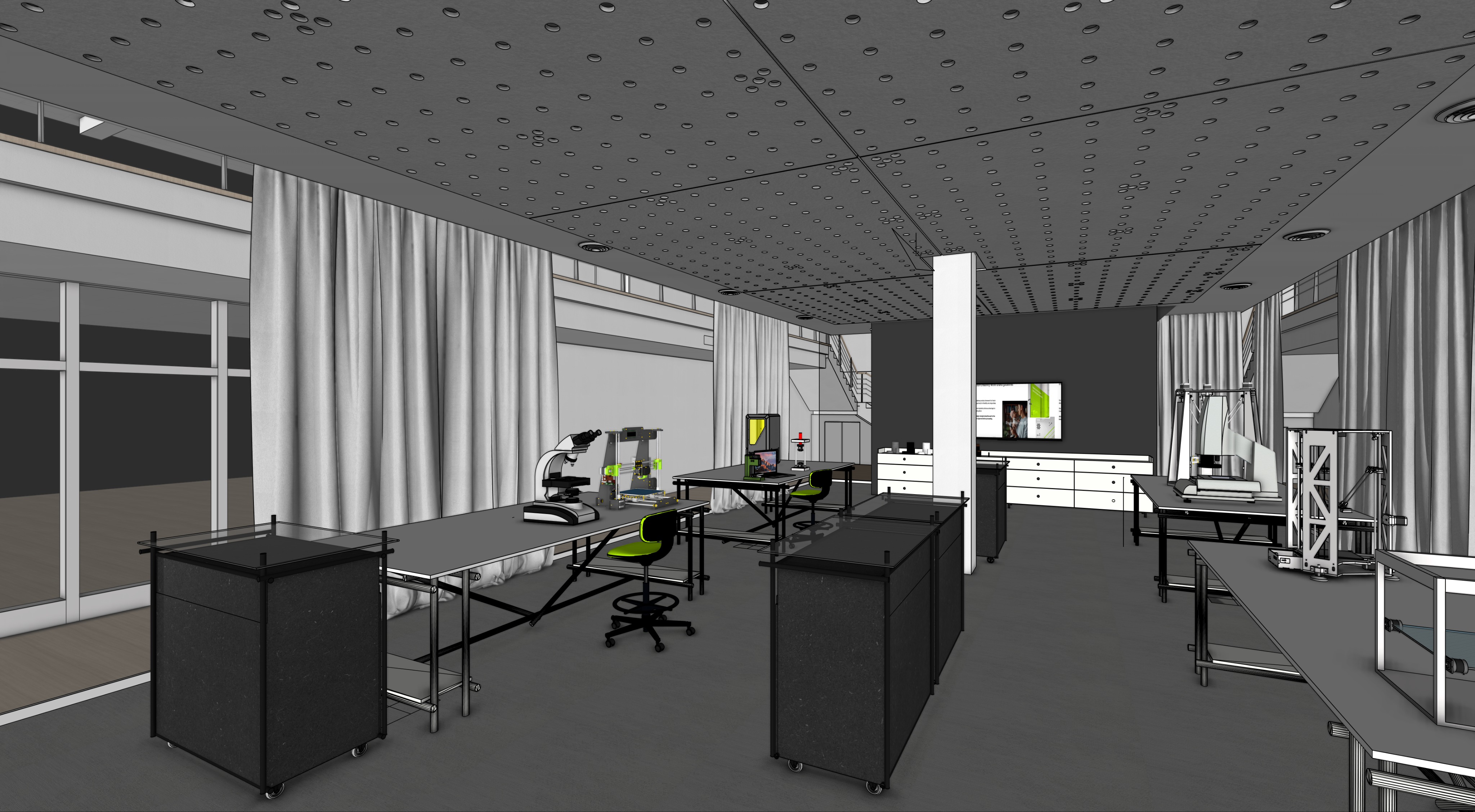 photorealistic visualizations of office spaces transparent glass walls interiors with predominantly white color light gray carpet back wall color anthracite white tables