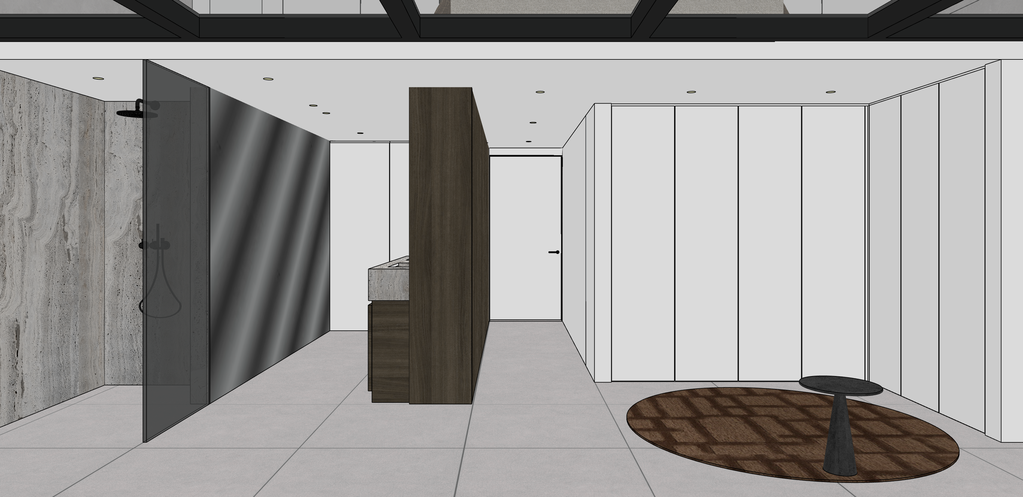 create a high end architectural interior realistic render calm and refined atmosphere soft natural daylight neutral warm palette balanced tones no orange cast diffused light with soft shadows subtle contrast natural color accuracy emphasis on materiality and texture tactile surfaces minimal styling clean architectural lines integrated design serene and timeless space depth and layering cinematic softness slightly desaturated tones photorealistic 35mm lens soft color grading quiet luxury emotional balance breathing space no harsh lighting no strong color cast no oversaturation maintain 100 of the geometry materials colours and layout with a sharp photorealistic result add more natural daylight most important materials concrete stucco warm grey ceramic tiles 90 x 90 cm fumed mirror glass open pore travertine titanium carpentry matt white add light to the ceiling spots