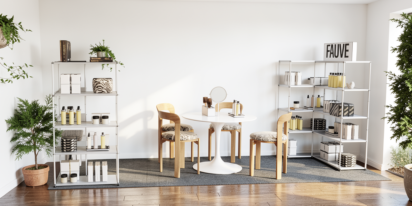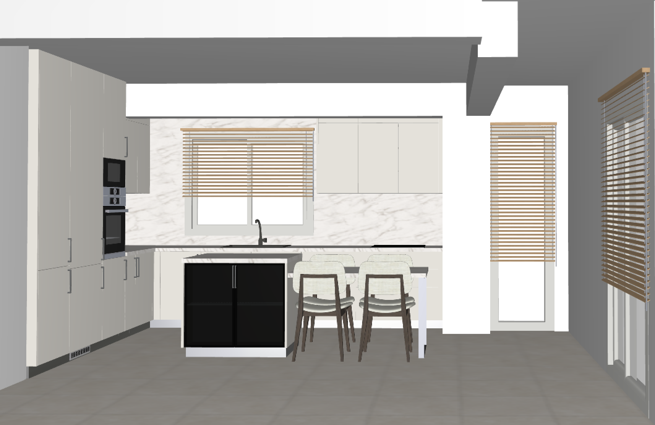render a modern kitchen with sleek lines and an inviting atmosphere use a soft cream color for the cabinets and a subtle beige marble for the countertops include a light gray tone for the walls and floor to add depth position a wooden chair with a muted green cushion at a smooth white table add a sleek silver coffee machine on the counter place a bowl of vibrant green apples and a beige vase with dried branches for decoration incorporate blinds with wooden slats on the window for a cozy feel ensure natural light illuminates the space highlighting the clean minimal design