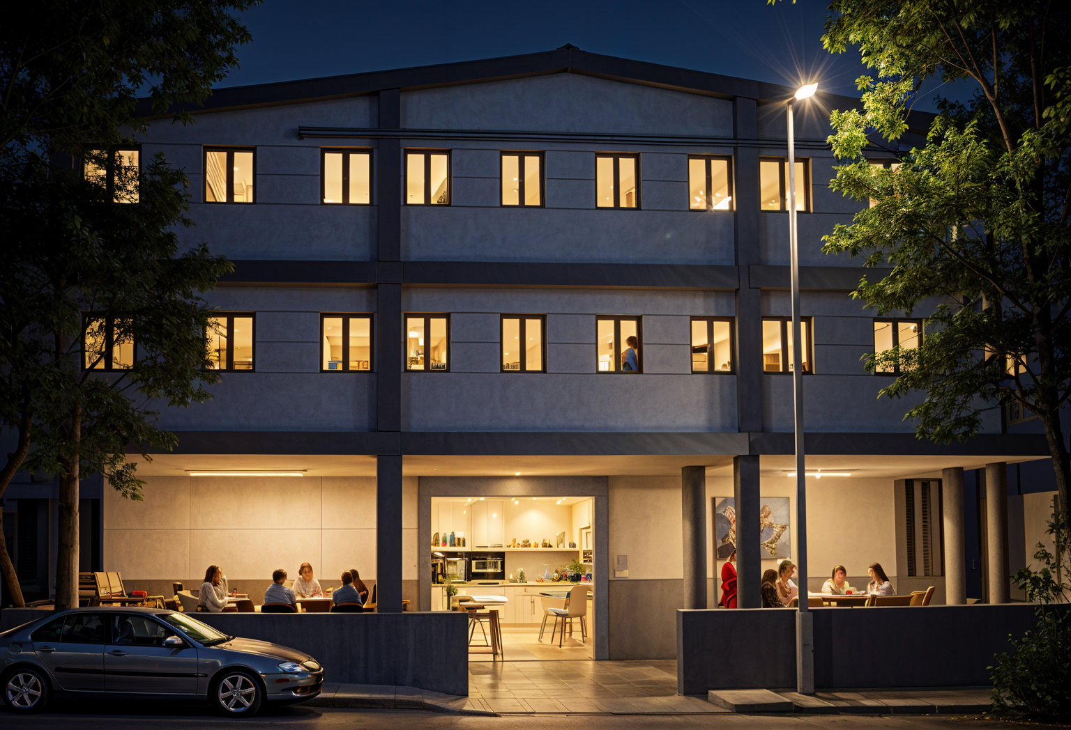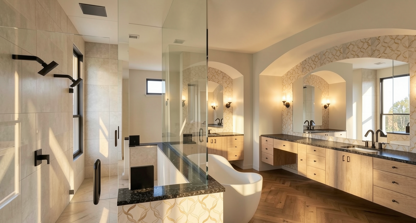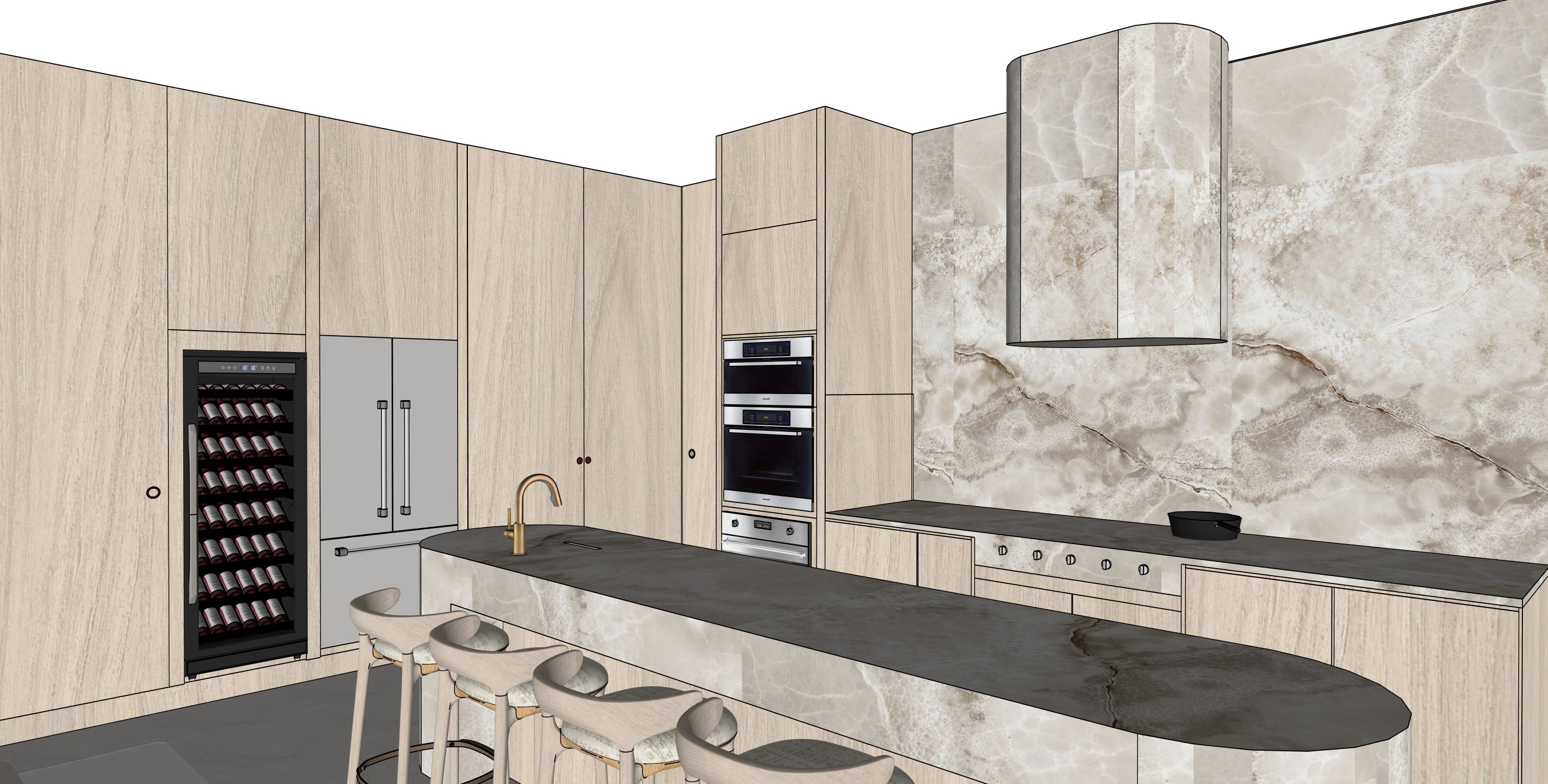 use the uploaded original 3d model image as the base preserve all geometry layout materials textures and camera angle exactly as in the original image keep the brushed nickel tap with a single subtle drain underneath it as in the reference image remove the sink but leave the benchtop clear use the reference photos for lighting mood shadows textures and overall ambiance creating a calm soft naturally lit environment add soft ambient natural light coming directly opposite the kitchen island with no light from the right side include ceiling lighting like in the reference photos and a linear pendant light centered above the island dropping the ceiling slightly if needed keep the range hood from the original model apply a realistic finish with soft shadows gentle reflections and diffuse highlights to match the references do not redesign or alter geometry layout materials or textures only adjust lighting ceiling pendant and tap drain details for realism and mood