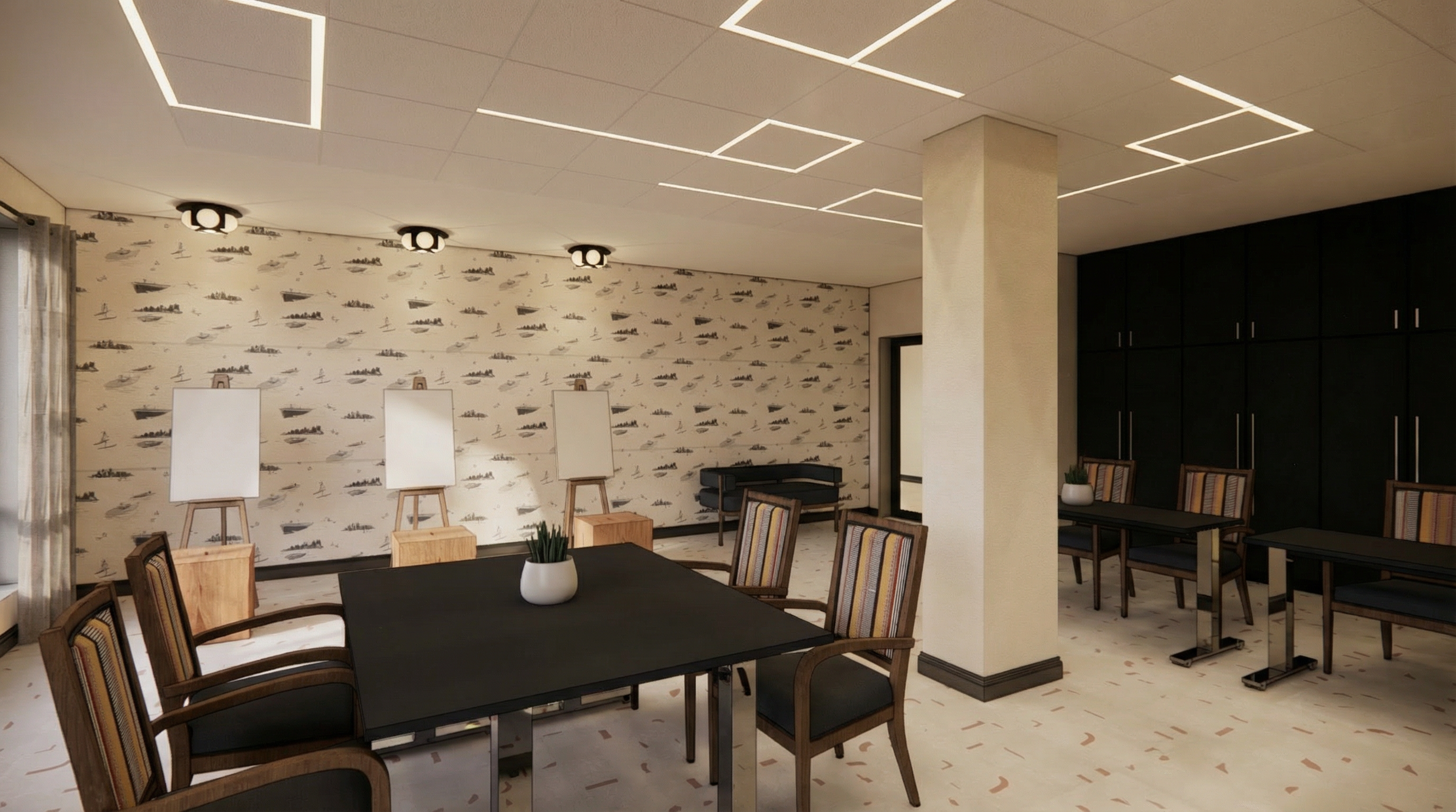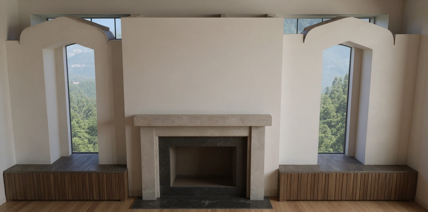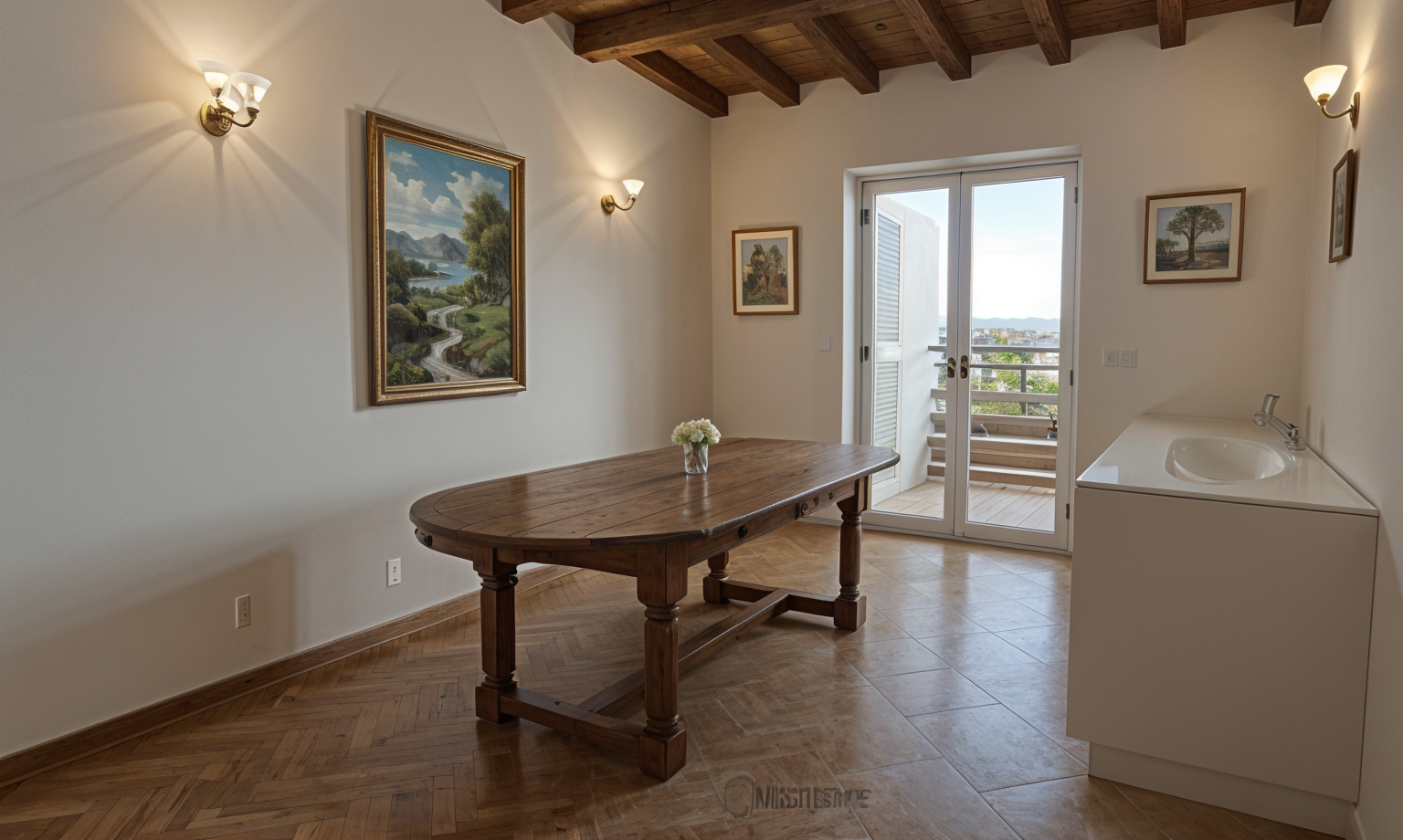 add oval massive olive table in the middle add pitcure on white walls and add 4 chairs color of elements on left and right can be light blue or some wood that would fit mediterranean style outside is another house and then sea wiew make interior lighter