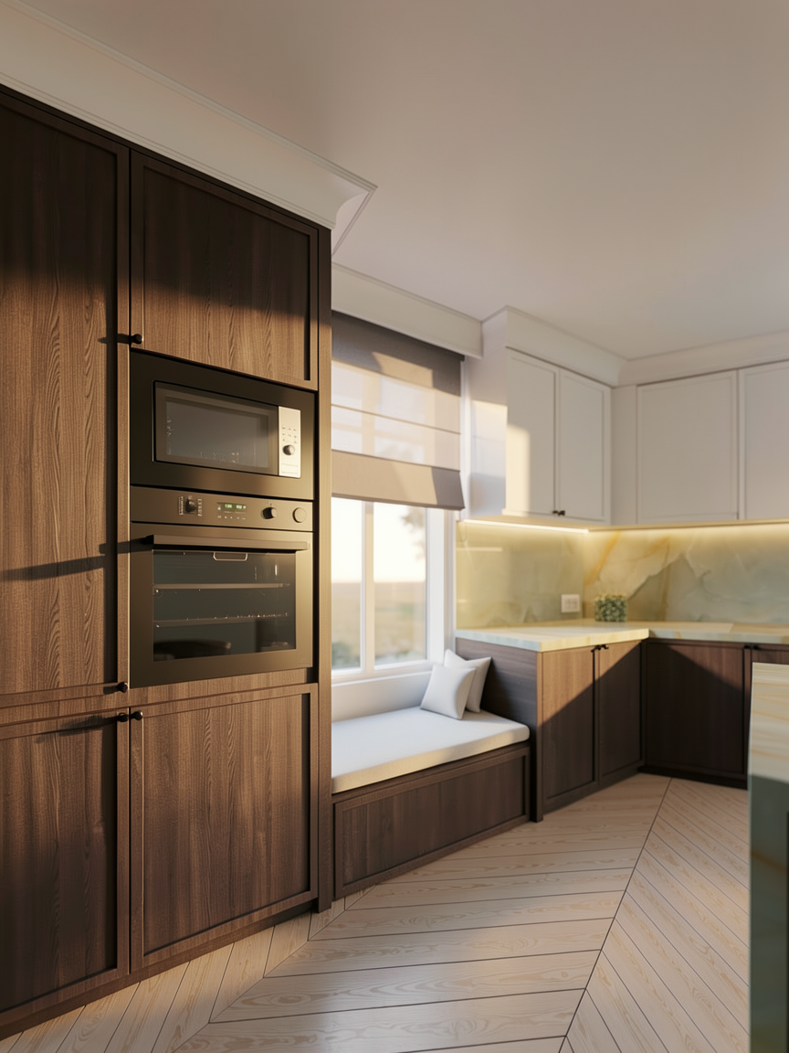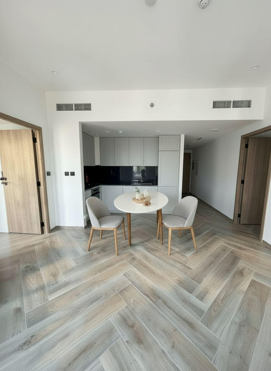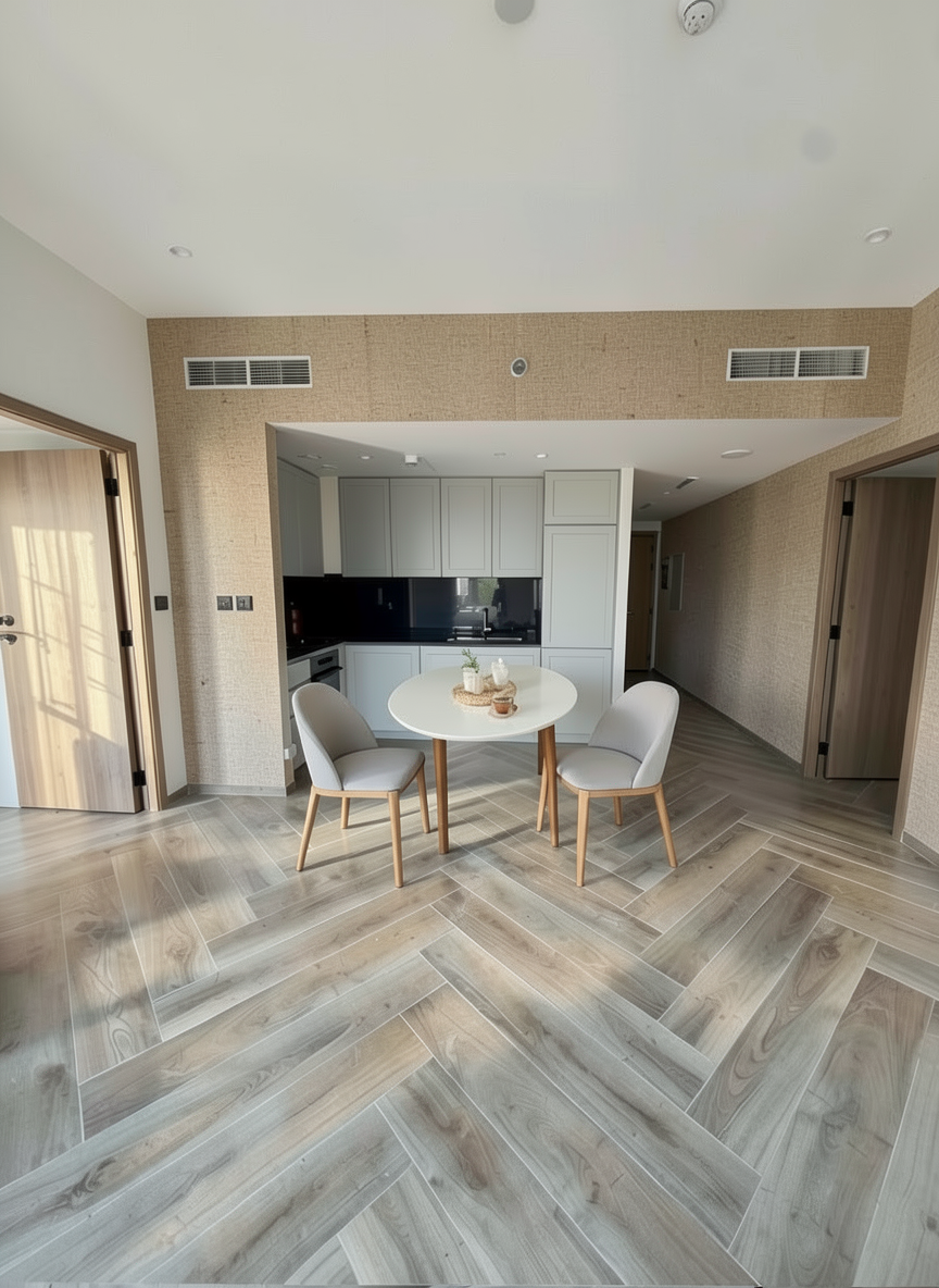 a modern lobby interior with a serene atmosphere featuring soft natural light streaming through large glass doors wooden wall panels in warm oak tones create a cozy ambiance contemporary furniture includes orange chairs with sleek black bases paired with minimalist white tables the flooring is a smooth gray slate providing a cool contrast ceiling lights are subtle and recessed enhancing the calm and inviting environment outside the glass doors a vibrant green garden is visible adding a touch of nature to the modern setting