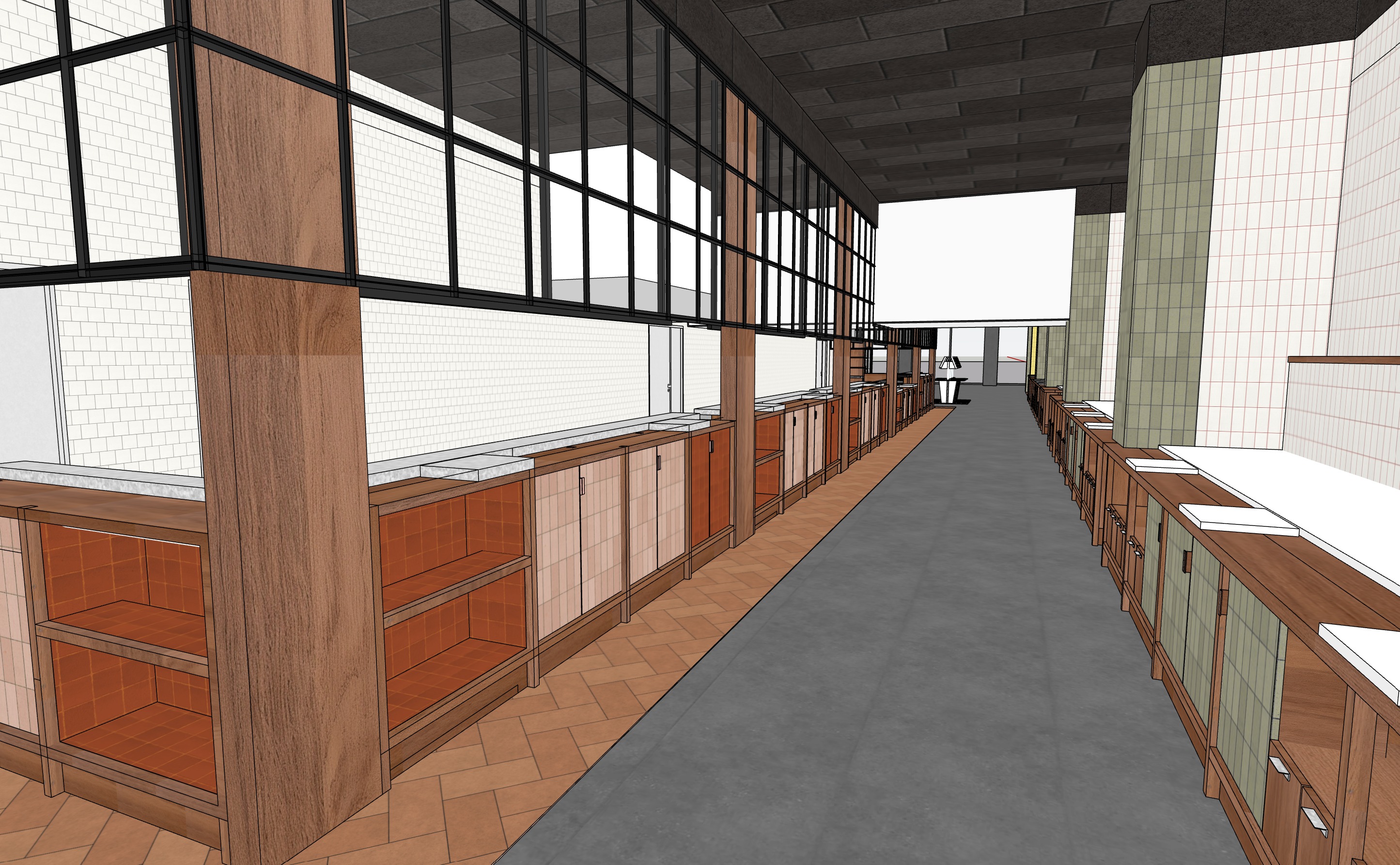 photorealistic view of a corporate restaurant in warm atmosphere people are walking wathnig the food counter