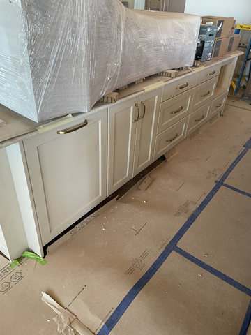 do not change the cabinets in any way preserve the exact cabinet colors materials finishes dimensions door and drawer styles hardware spacing alignment and all geometry exactly as shown do not alter the countertop shape backsplash appliances flooring lighting fixtures or wall structure only remove the construction materials clutter and mess from the scene clean the room and make it look finished and staged add a few simple tasteful home accessories appropriate for the style of the space but do not add or remove any furniture windows or architectural elements maintain the original lighting direction and realism enhance clarity and polish the photo while keeping the cabinetry and room design completely unchanged do not alter the lighting to keep the cabinet colors as they are in the image add new flooring and countertop stage for a kitchen island