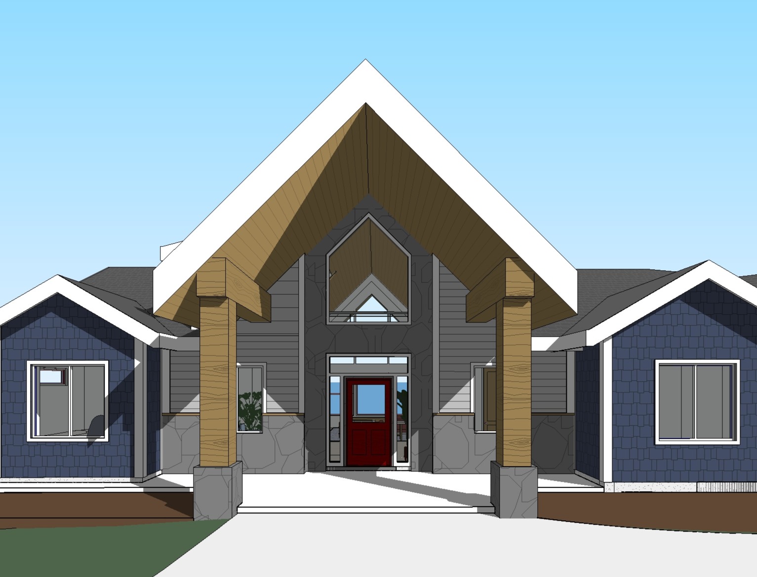 make look realistic add front landscaping and surrounding trees make sure the materials are symmetrical on either side of the door the posts and beams in the front are wood