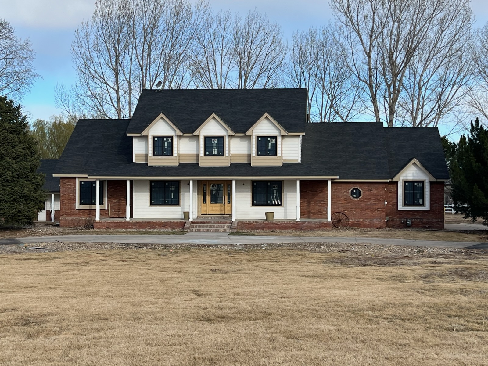 do not change the house structure or layout at all only change to have all white siding with black trim make the door black make the columns black on the porch add simple landscaping