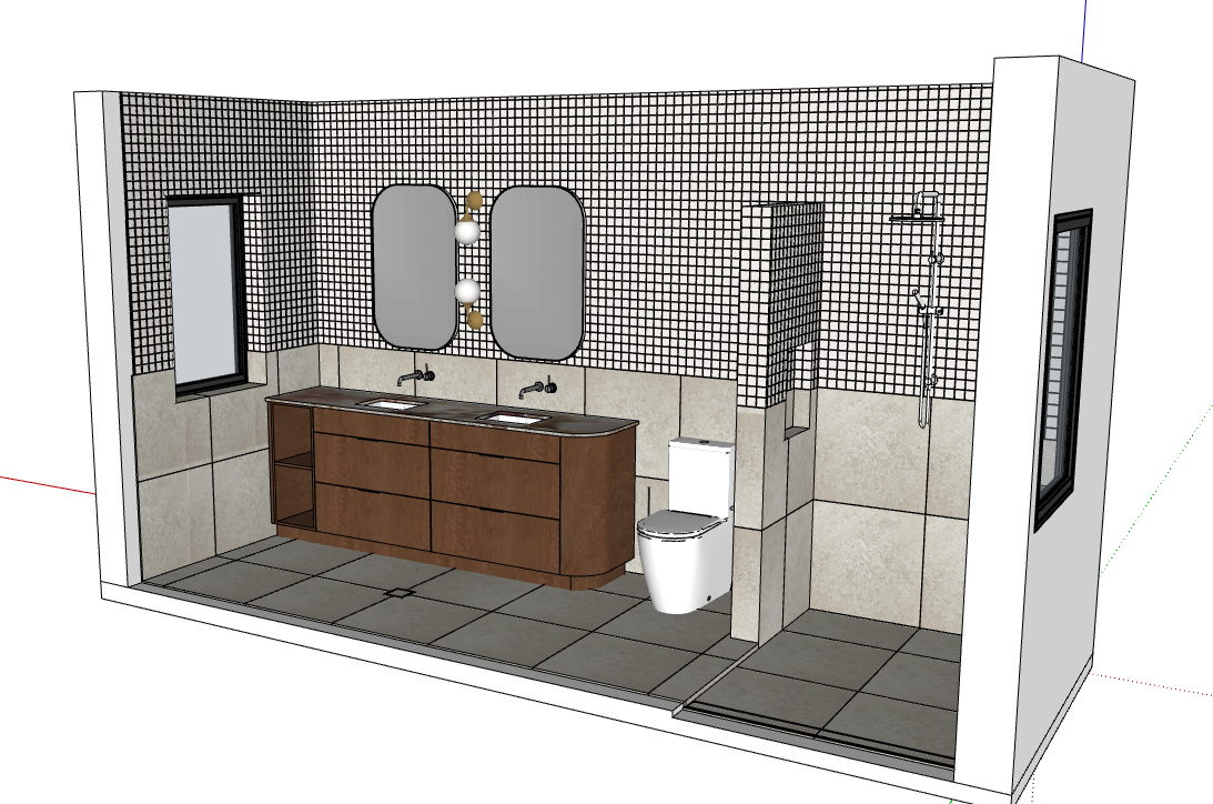 maintain the structure of the tiling cabinetry and items in the bathroom maintain the angle of the camera ensure you hold the integrity of the structure of the image as it is modelled correctly do not interpret and assume just enhance the image from a model to a realistic image dont render anthing outside of the walls of the image