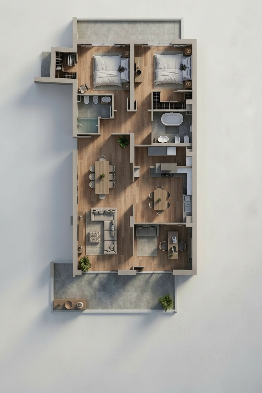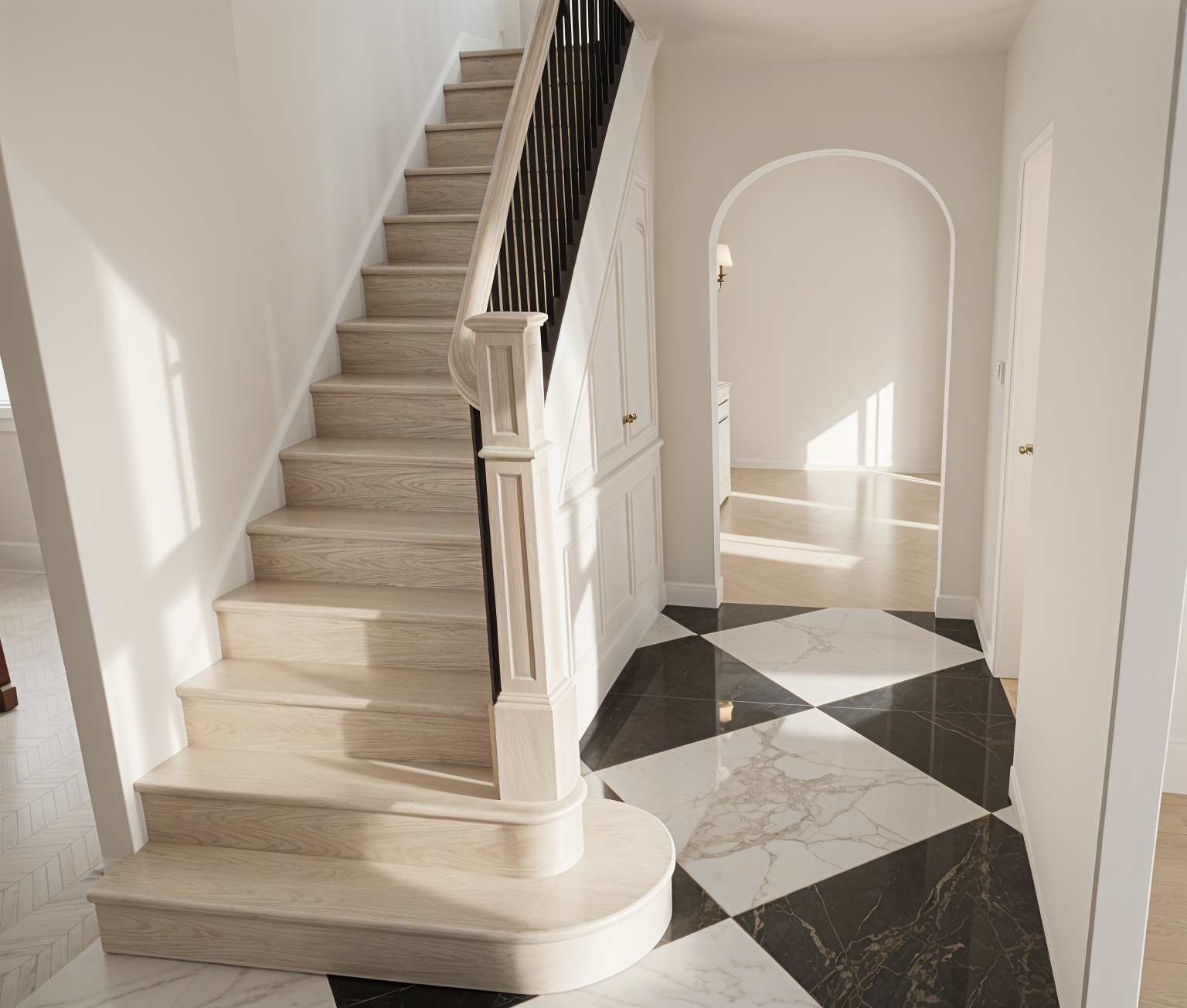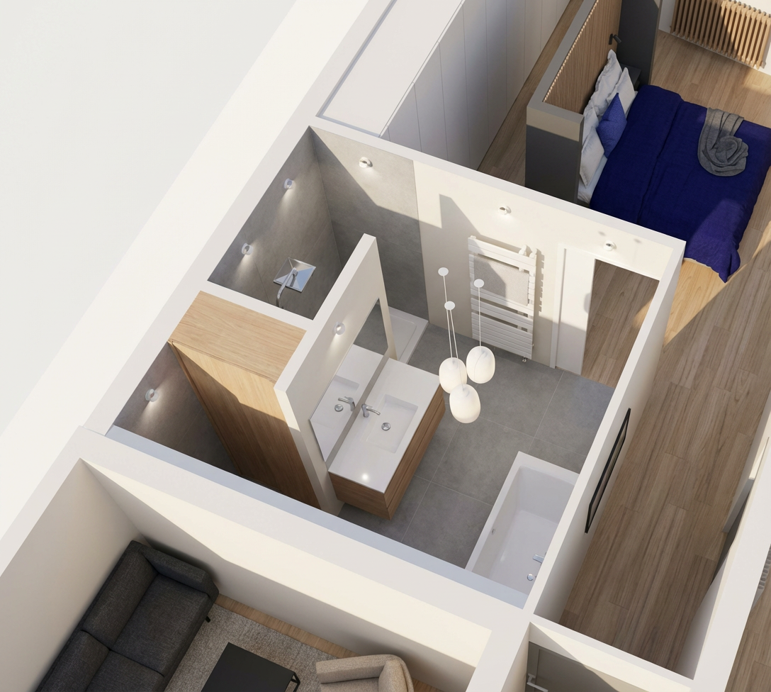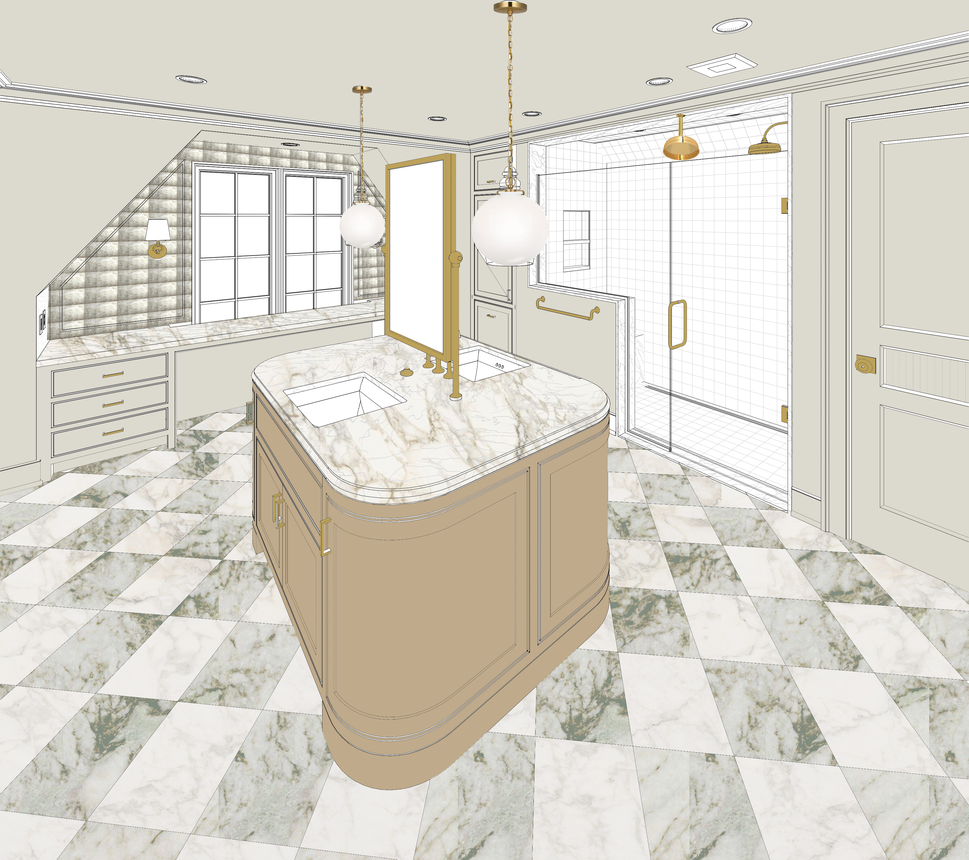 luxury transitional primary bathroom maintain the existing layout scale and architectural details exactly as shown do not alter window placement ceiling height or camera perspective apply a light sage green and white marble checkered pattern to the floor tile use a coordinating white marble slab for the countertops and bathtub surround matching the tone and veining of the floor tile at the window wall install antique mirrored 4x4 tiles as a backsplash feature vanity to be a wood tone with a soft natural finish all plumbing fittings and hardware to be brass vanity faucets to be waterworks opus low profile three hole deck mounted faucets with crystal egg handles in brass use waterworks plumbing for the shower use neutral tile for the shower walls and floor lighting to remain as specified over vanity visual comfort katie globe pendants do not change lighting placement scale or fixture design add soft natural sunlight streaming through the window casting realistic shadows and highlights across the space through the window show a subtle second floor backyard view with greenery keeping it soft and slightly out of focus so the interior remains the focal point ensure materials feel high end and cohesive with a calm elevated palette and refined contrast between sage green tones warm wood and brass accents