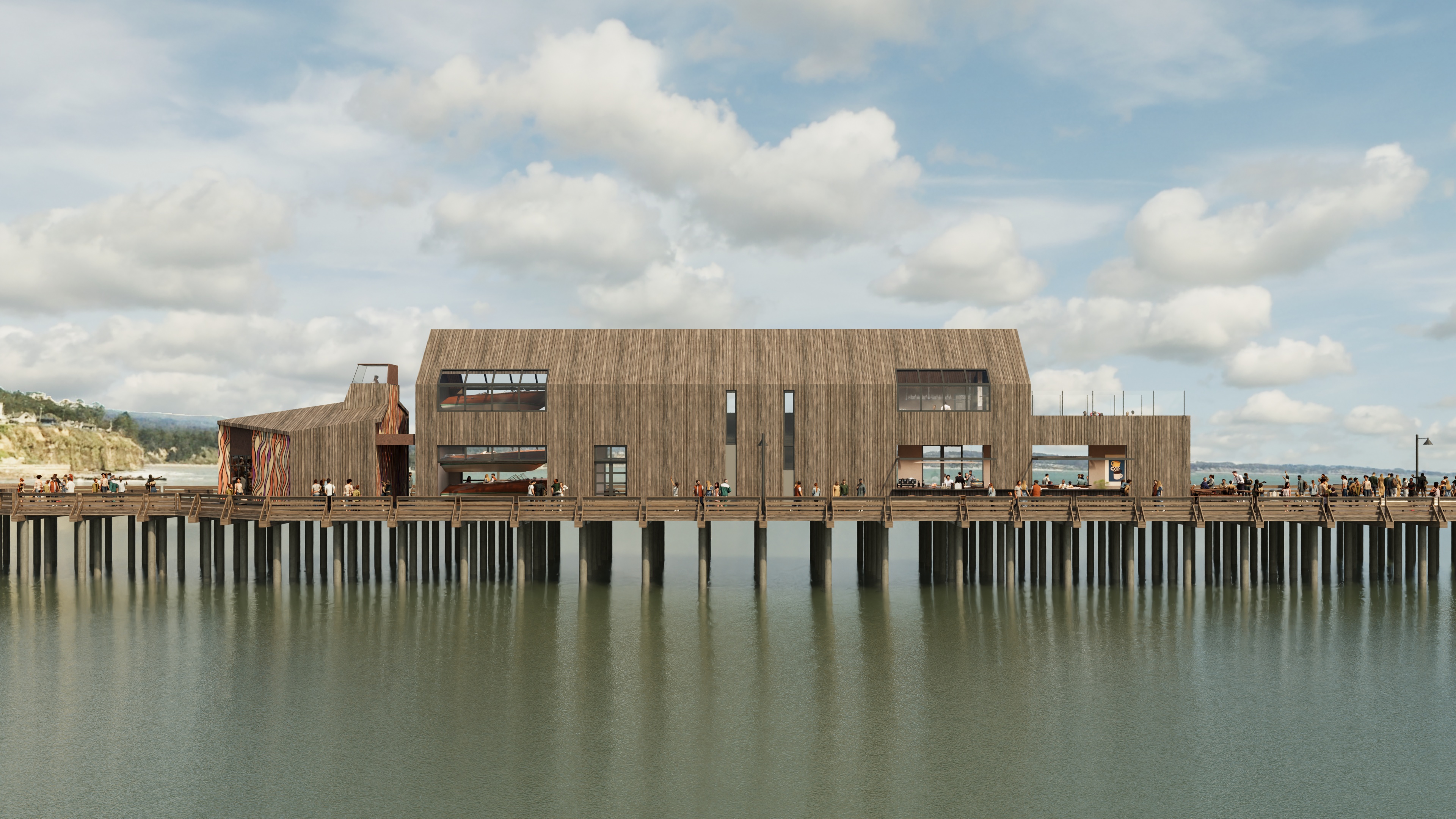 can you make this at dusk with lots of light glowing from the inside and people dancing on the upstairs deck remove the market lights the people on the second level need to be lower behind the partition