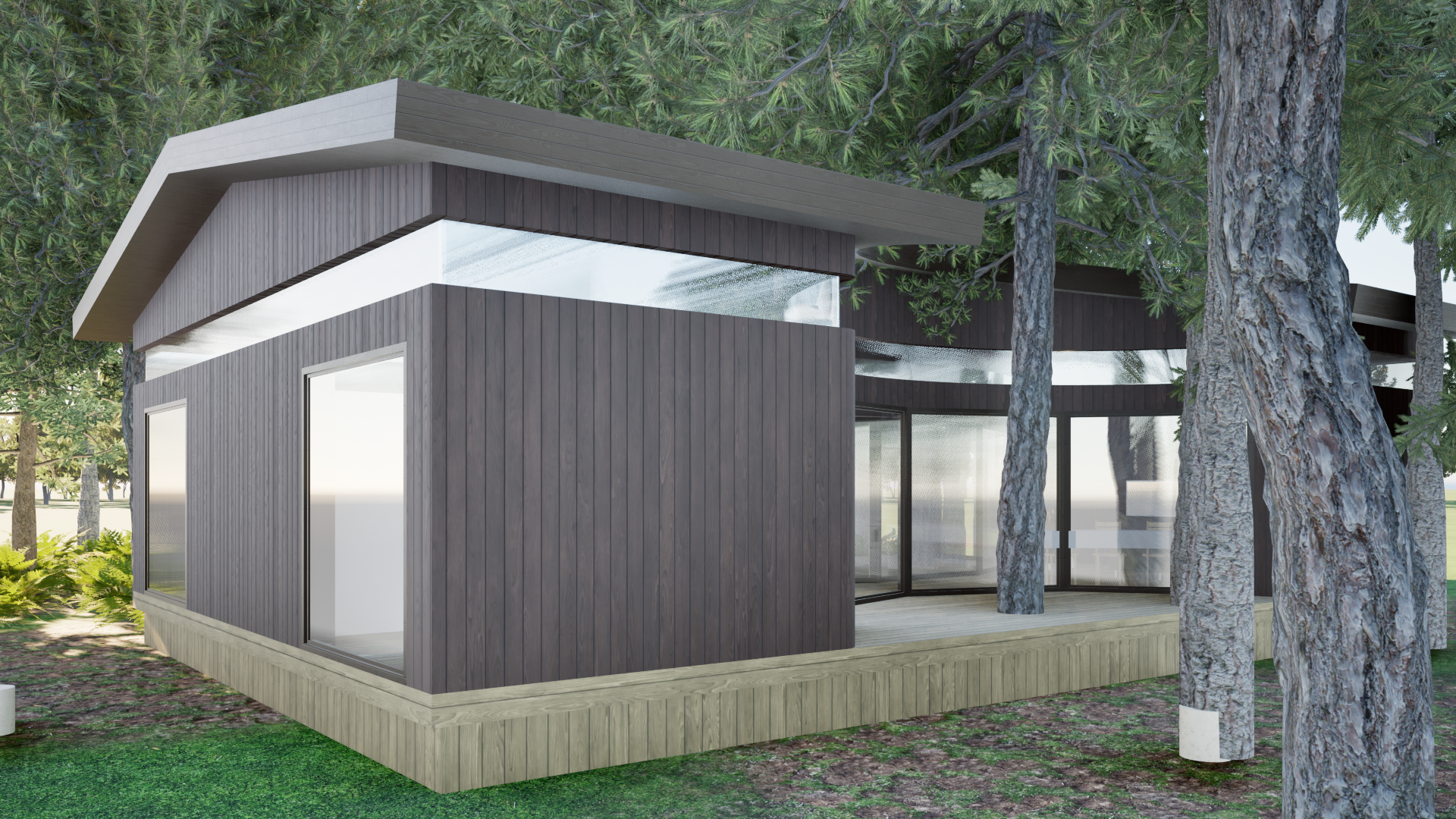 exterior shot cosy dark wood house in forest pine and ferns forest ground only nature
