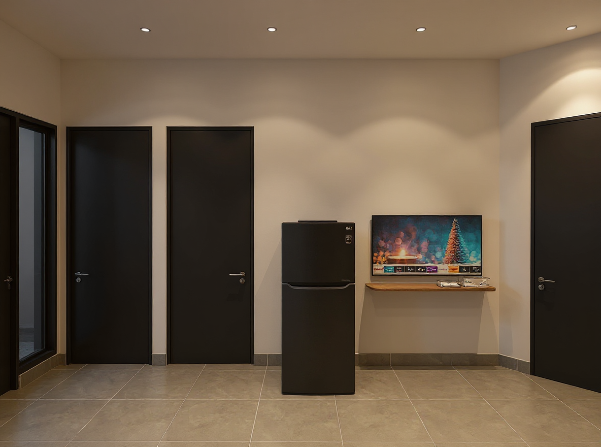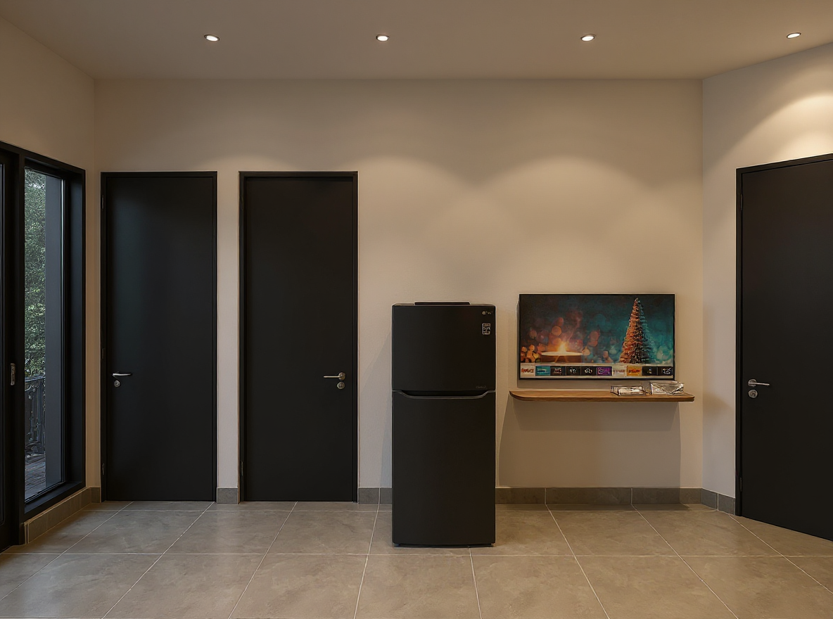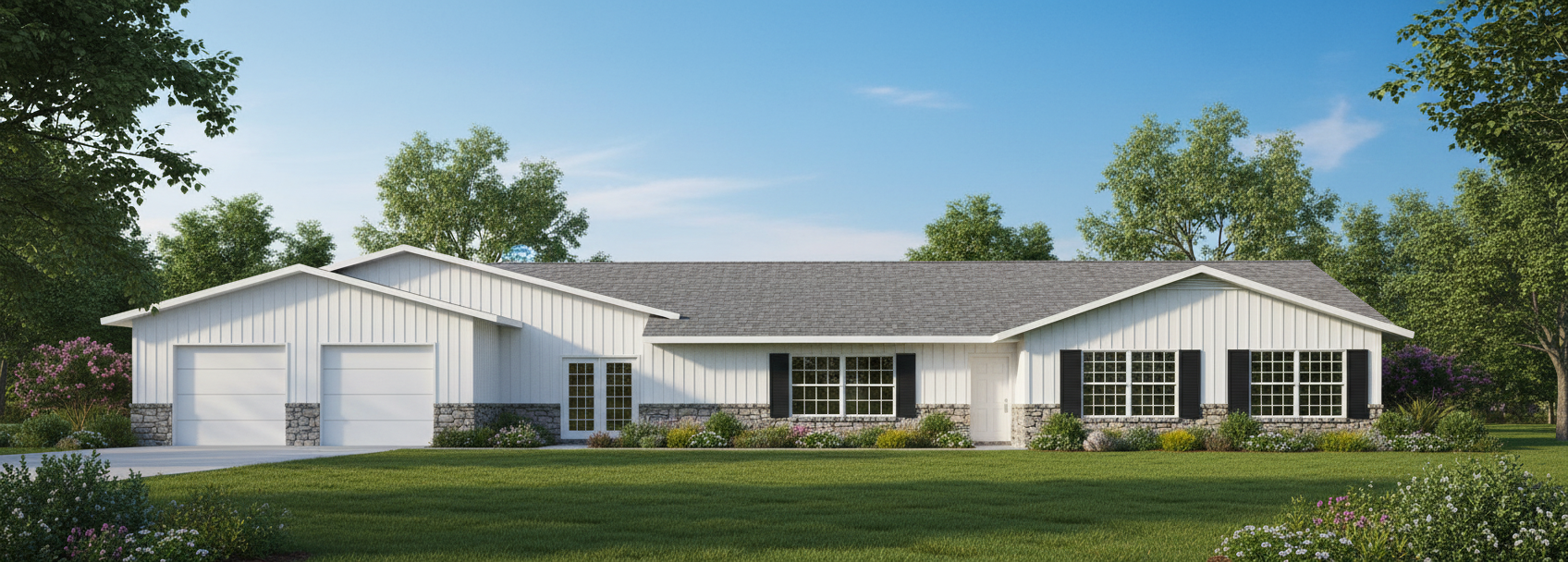 a modern ranch style house with a minimalistic design the exterior walls are painted in a soft warm beige the roof has a gentle slope covered in dark charcoal shingles large windows with white frames reflecting the soft golden light of the setting sun add lush greenery around the house with vibrant green grass and colorful flowers like daisies and marigolds a clear blue sky above with a few fluffy clouds creates a serene and peaceful atmosphere