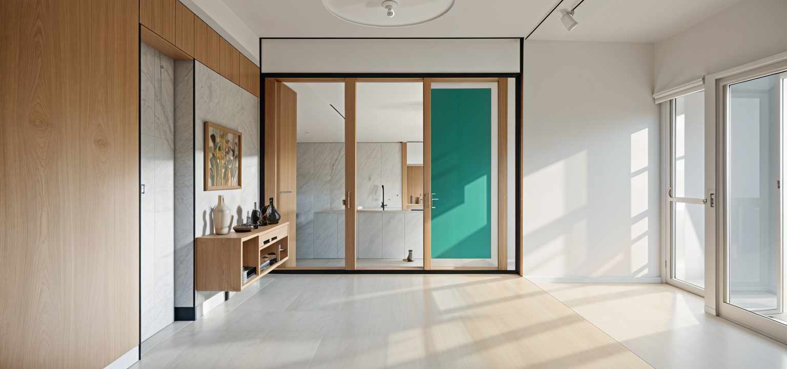 modernist exterior shot on the left there is a light brown wall at the bottom there are bushes the colour of the wall is white and there are three windows architecture