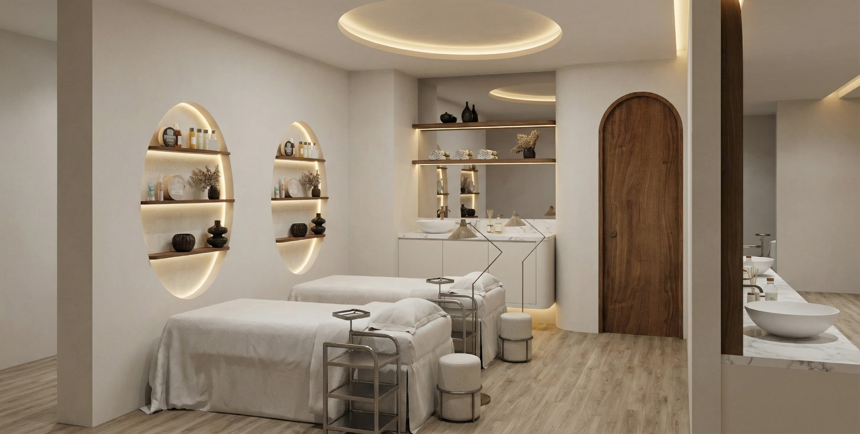 create ultra realistic images without changing any structure shape design or materials do not resize jpegs beige wood vinyl flooring plain off white walls white bed white marble to table background shelf is mirror