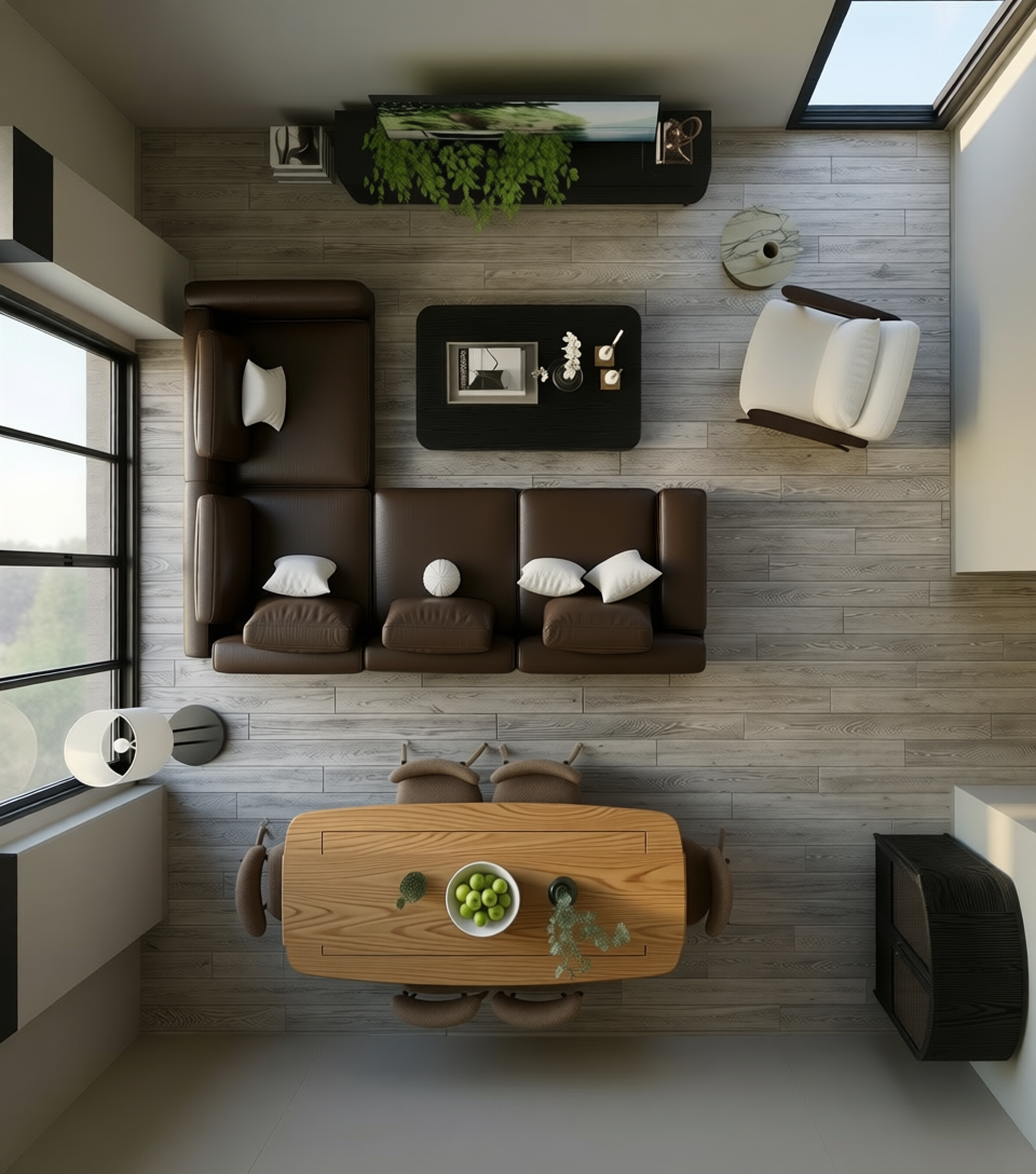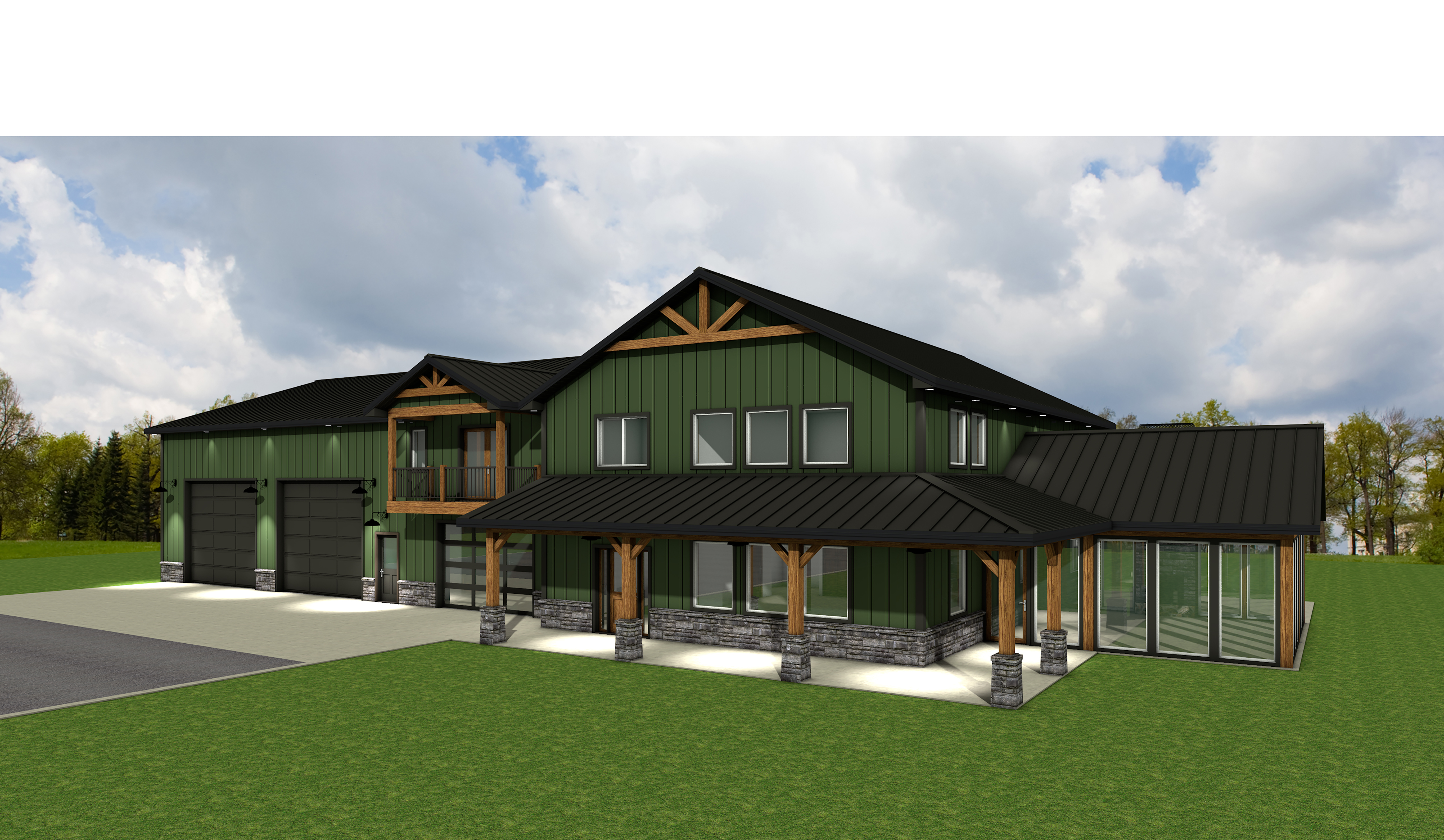 a modern two story house retain the exact structure and window arrangement patio columns rooflines foundation height and proportions exactly as shown in the reference image integrate into the terrain surround the property with a lush dense forest of mixed hardwoods that are a little further back add warm golden sunlight subtle dappled highlights across the siding and grass create ultra realistic lighting crisp shadows detailed textures in the siding and glass reflections and an overcast sky show only a few lights visible inside render in hyper realistic architectural visualization quality 8k resolution add a driveway tying into the the concrete garage door apron make it the fall season