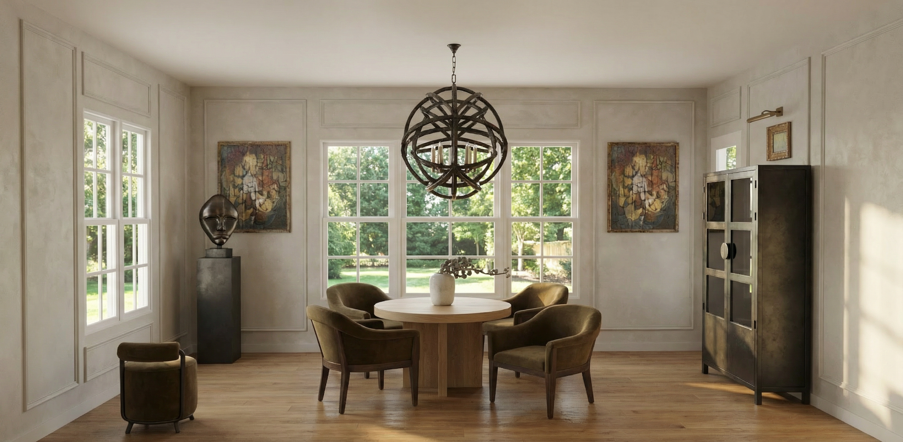 the rug is a grey brown color with a pattern the floors are an oak color the table is light oak wood the chairs are a brown olive fabric with wood legs the walls have a subtle greige limewash paint on them the outside environment is trees and a yard