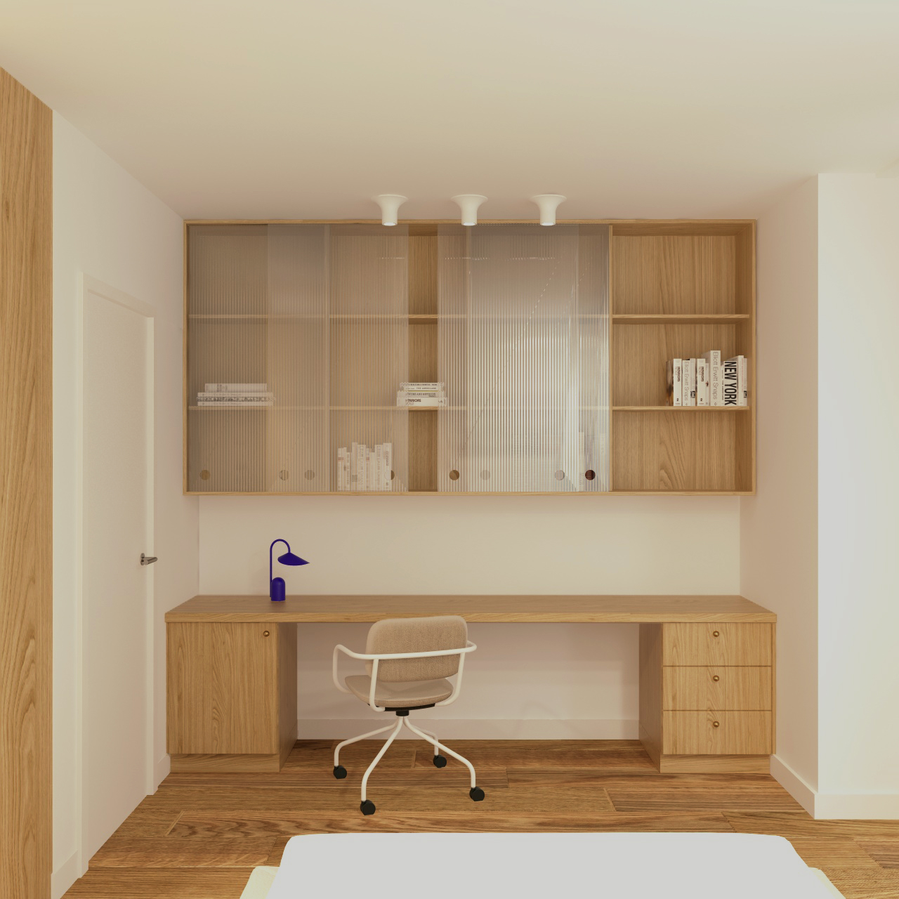 enhance the photorealism of this architectural visualization while preserving the design exactly as it is do not alter any materials colors textures finishes furniture layout proportions or architectural elements maintain all existing material tones and surface characteristics precisely as shown improve realism strictly through lighting and rendering refinement physically accurate artificial lighting simulation natural daylight entering from the background with correct light temperature separation realistic global illumination and secondary light bounce high dynamic range lighting hdr with balanced exposure soft natural contact shadows accurate ambient occlusion in corners and object intersections subtle physically correct reflections refined material roughness without changing material type or color micro contrast enhancement for surface depth extremely subtle surface imperfections fine micro variation only no texture change very delicate natural depth of field cinematic but neutral color grading no color shift no stylization ensure correct light interaction between artificial interior lighting and daylight from the background preserve the original atmosphere and composition no redesign no restyling no object modification final result should resemble a high end professional architectural photograph ultra realistic natural optically accurate well balanced and physically plausible the colour of the wood should stay warm and oak