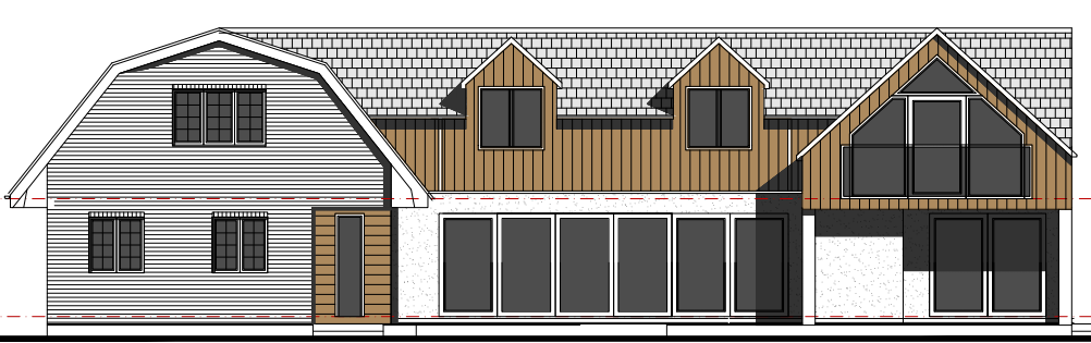 use a weathered yellow brick for the leftside gable end and white render for the rest of the ground floor facing material fascias should be wooden add trees to the background sun is top right areas of brown are to be timber cladding all doors to be dark grey the top floor is set back from the the ground floor