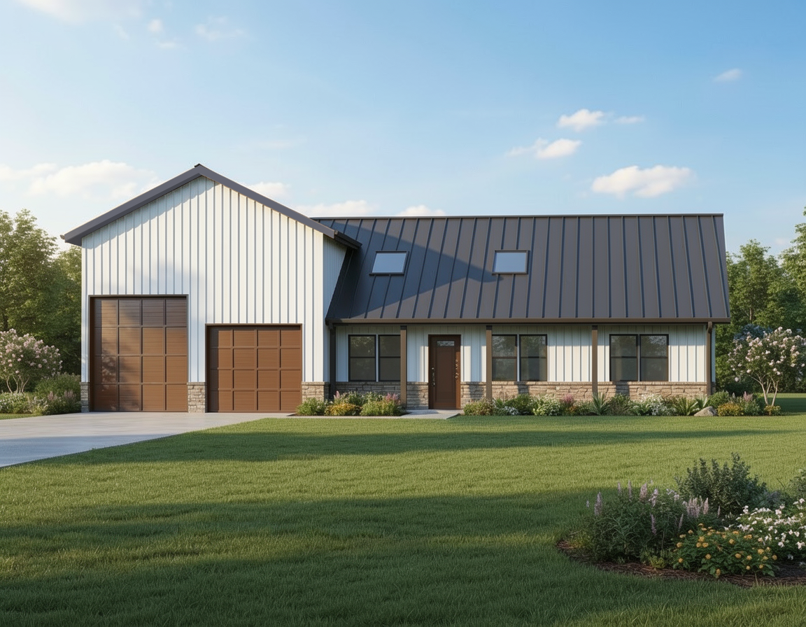 exterior shot keep the roof black make the walls dark gray and the stone gray garage doors and front door stay brown