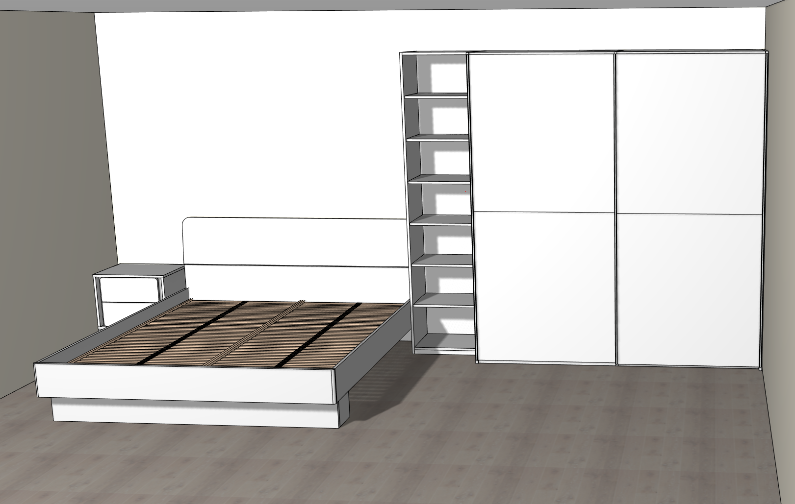 a modern minimalist bedroom with a clean design the walls are painted in soft white for a fresh and spacious feel the bed frame is sleek and contemporary featuring a light oak wood finish with white accents the built in wardrobe and shelves are pure white contrasting elegantly with the subtle gray wall on the side the nightstand matches the bed frame with a light oak and white combination the flooring is a warm light gray wood texture providing a cozy atmosphere a soft ambient light fills the room creating a calm and serene environment add some wall decorations