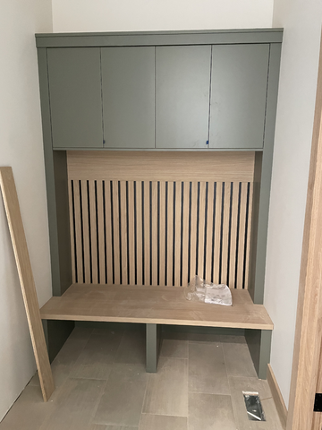 do not change the cabinets in any way preserve the exact cabinet colors materials finishes dimensions door and drawer styles hardware spacing alignment and all geometry exactly as shown do not alter the countertop shape backsplash appliances flooring lighting fixtures or wall structure only remove the construction materials clutter and mess from the scene clean the room and make it look finished and staged add a few simple tasteful home accessories appropriate for the style of the space but do not add or remove any furniture windows or architectural elements maintain the original lighting direction and realism enhance clarity and polish the photo while keeping the cabinetry and room design completely unchanged do not alter the lighting to keep the cabinet colors as they are in the image stage for a mudroom do not change lighting or paint colors