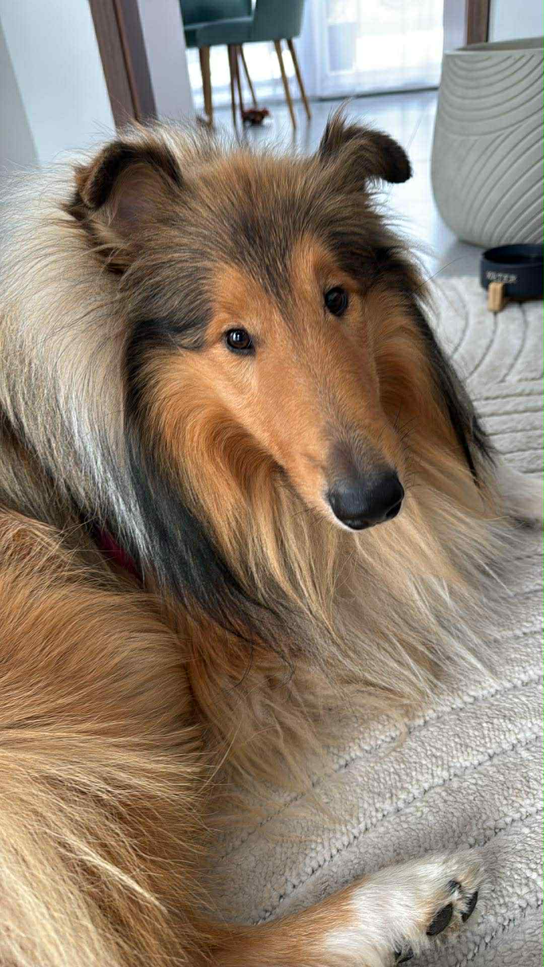 transform the dog from the photo into a dignified aristocrat maintaining its natural four legged canine anatomy do not give it human shoulders or hands instead dress the dog in a luxurious high fashion royal cape made of deep crimson velvet and ermine fur draped naturally over its back and chest add a majestic oversized gold embroidered lace ruff collar tailored for a dog s neck the dog should be sitting in a noble pose on a vintage persian rug style 18th century royal portraiture oil on canvas rich moody background museum quality subtle humor through extreme elegance light colours