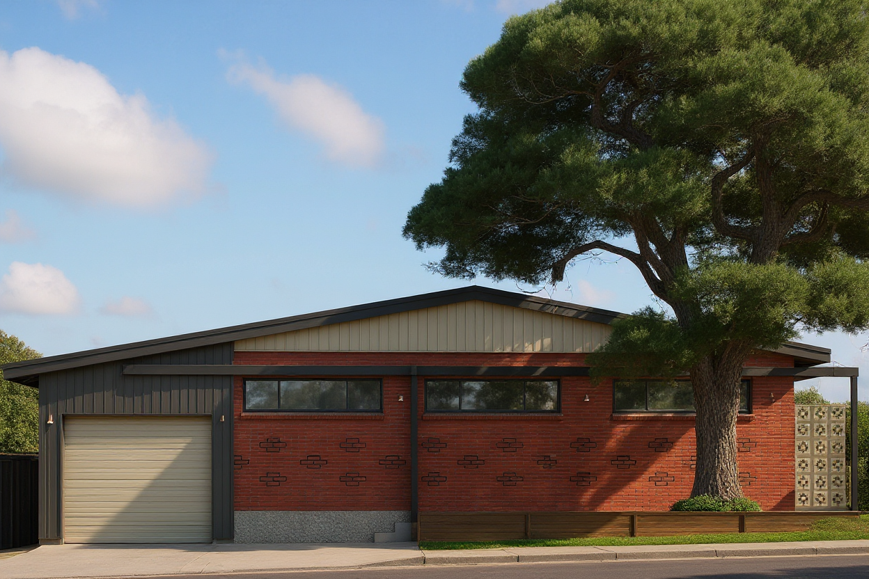 create a high resolution photo realistic render of this two story farmhouse style home with an attached three car garage retain all architectural dimensions proportions materials and features exactly as shown the grey vertical siding dark trim stone foundation black framed windows timber gable detail wraparound porch with posts roof shapes and overall structure preserve the layout between the house and the garage including the roof connections and overhangs place the home in a lush dense forest environment add tall trees surrounding the property with warm sunlight streaming through the branches creating natural highlights and soft shadows across the house garage porch and grass maintain realistic lighting depth and texture to achieve a fully immersive natural setting