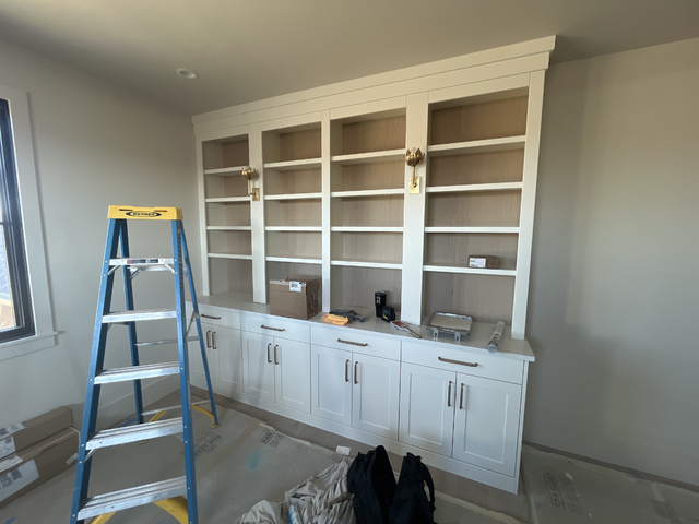 do not change the cabinets in any way preserve the exact cabinet colors materials finishes dimensions door and drawer styles hardware spacing alignment and all geometry exactly as shown do not alter the countertop shape backsplash appliances flooring lighting fixtures or wall structure only remove the construction materials clutter and mess from the scene clean the room and make it look finished and staged add a few simple tasteful home accessories appropriate for the style of the space but do not add or remove any furniture windows or architectural elements maintain the original lighting direction and realism enhance clarity and polish the photo while keeping the cabinetry and room design completely unchanged do not alter the lighting to keep the cabinet colors as they are in the image add a view out the window turn the lights on add new flooring and rug put pictures on the walls stage the open shelves as a minimalistic library