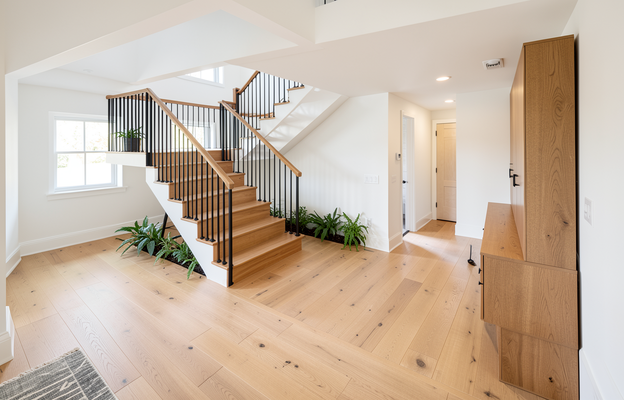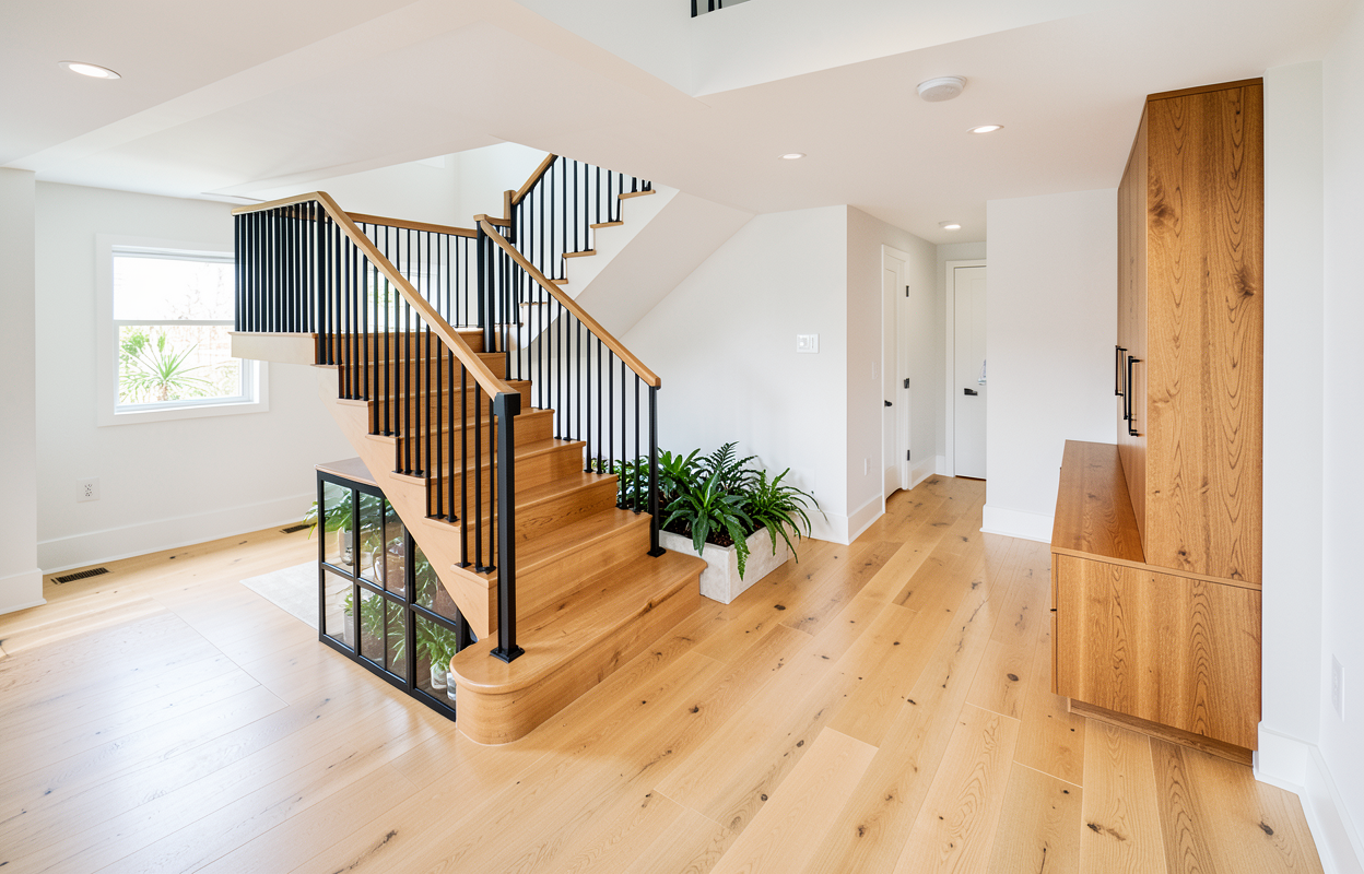 traditional solid staircase light wood flooring color right side mudroom cabinets wood finish interior walls white modern black stair railings under stairs solid