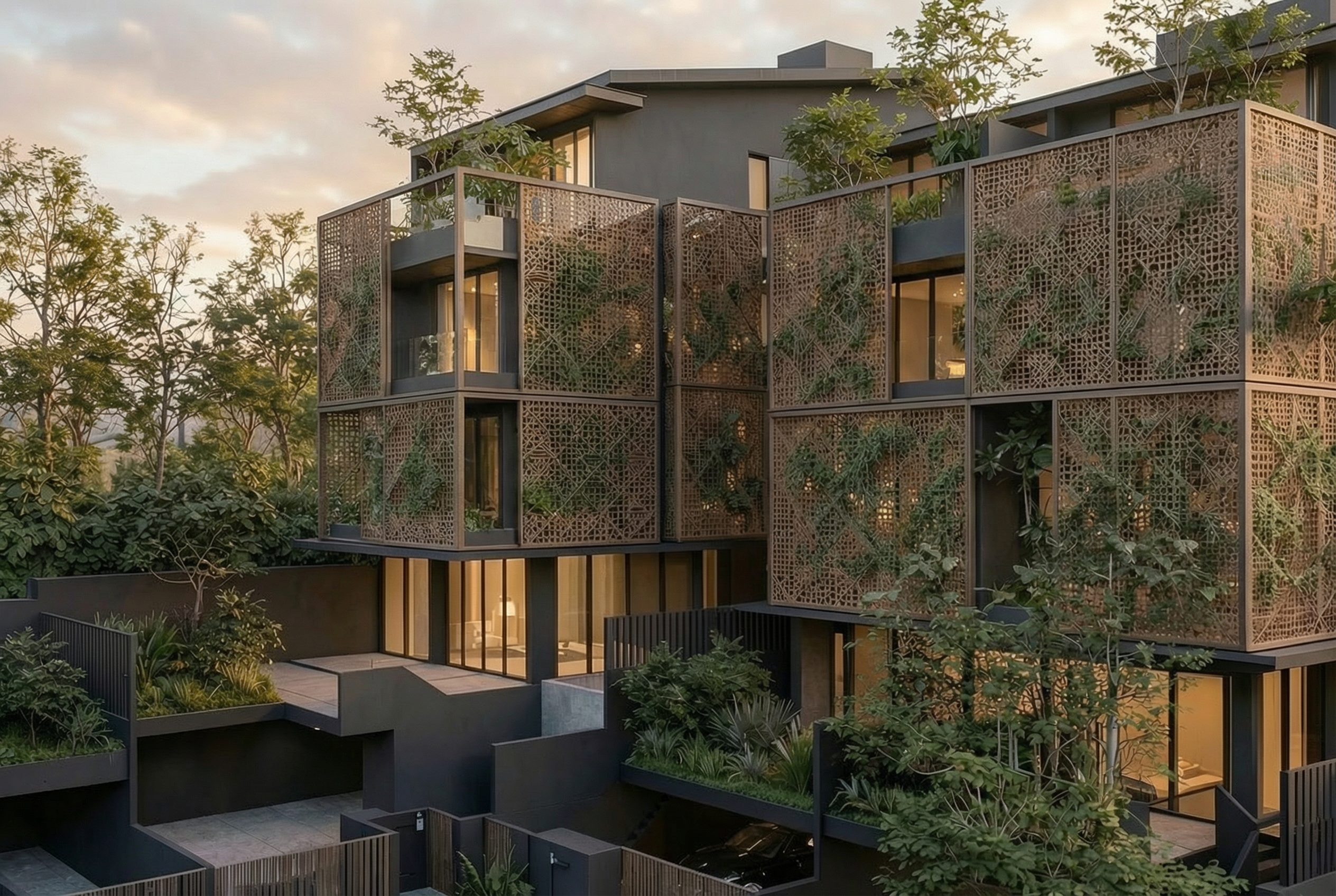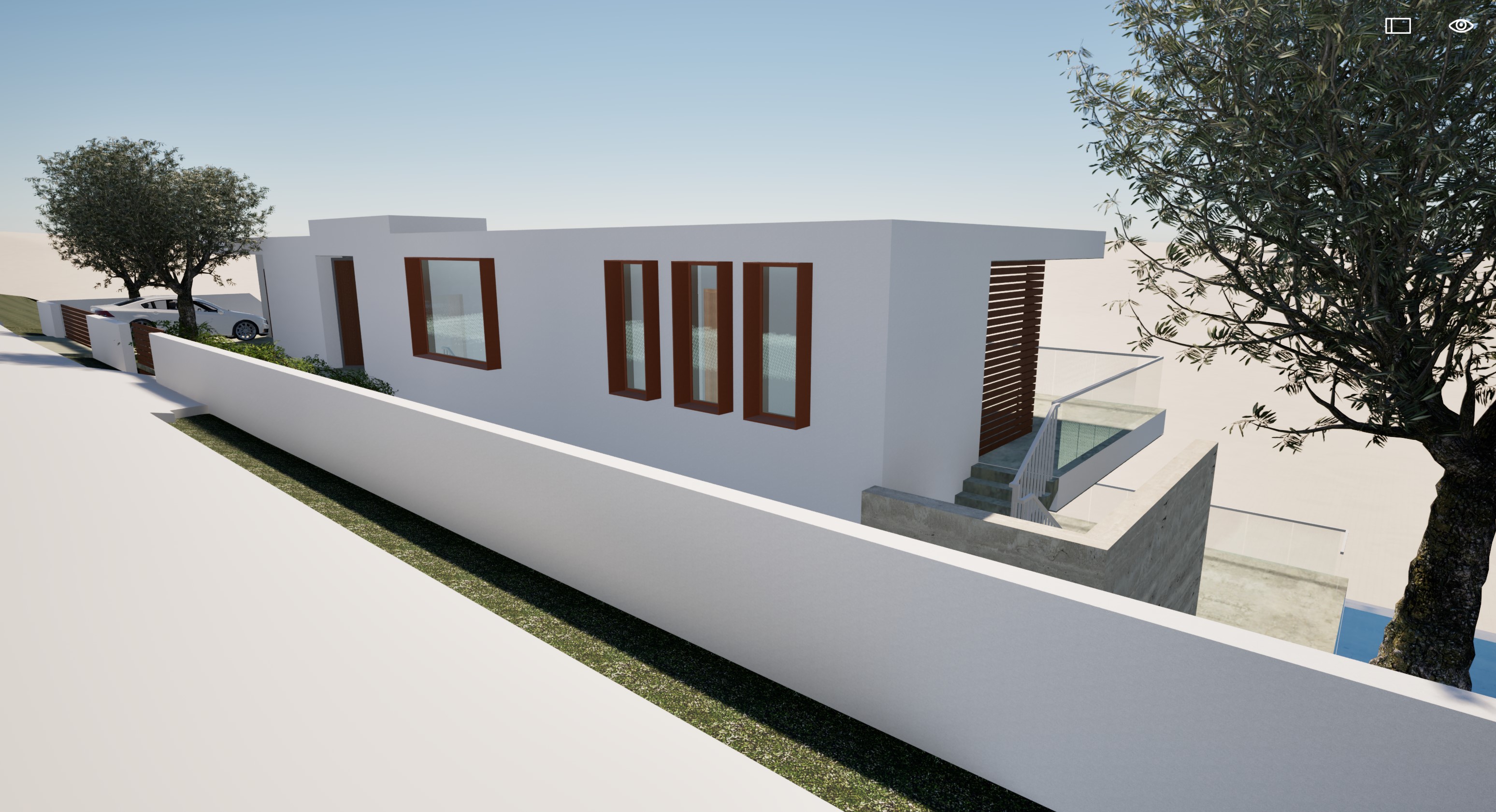 a modern house in pacific palisades ca overlooking the pacific ocean with smooth white plaster finish corten steel window trims view on a hill with lush green grass and olive trees and california native bushes and houses surrounding the building california sunny clear blue skies