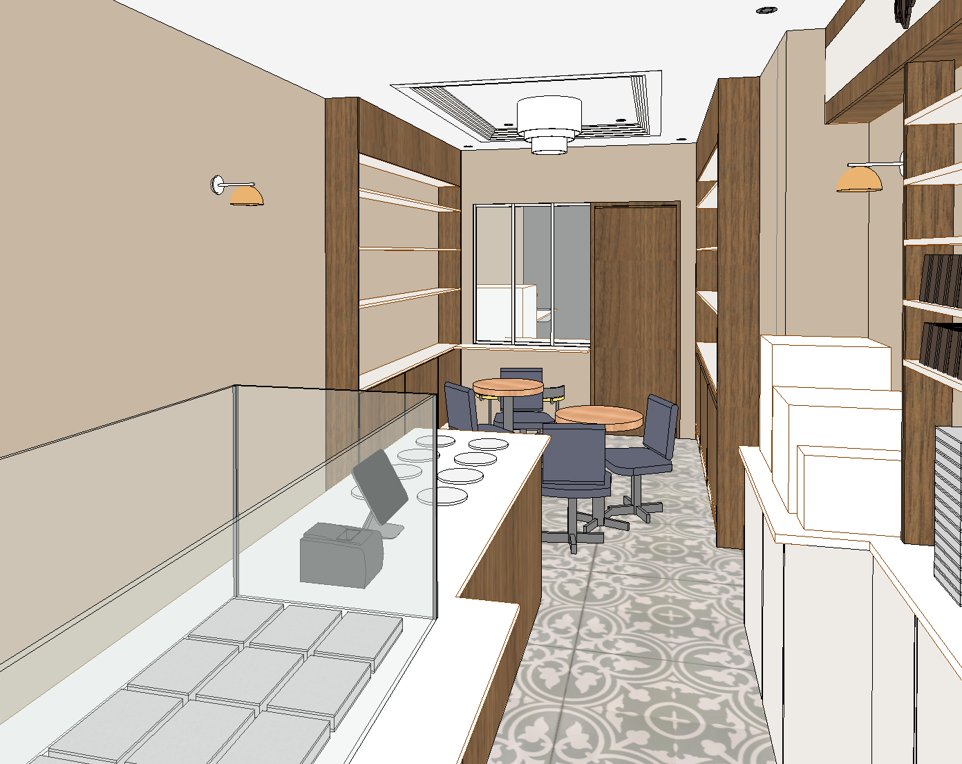 keep image exactly the same don t add or remove anything just make 8k high quality photorealistic render of a chic chocolate shop interior features sophisticated walnut timber joinery and a ivory cream subtly speckled benchtops and shelves large glass viewing window at the rear looking into the production area for customers to see in and a solid door on the right two french style small tables and french style chairs chandelier at the rear of the store in a recessed ceiling with led strip lighting wrapping the recessed ceiling led strip lightings in locations of dashed red lines 1 wall light is brushed antique gold emitting a warm white glow for an inviting atmosphere with black and white photo underneath the internal walls are painted in a brown toned white colour the internal floor is a tesselated tile with pale green and white patterns there is a large bon bon chocolate glass cabinet on top of the benchtop and gelato one the right of the post machine cold drink maker coffee machine and milk frother on the shelf on the right with chocolates in an upright stacked orientation on the shelves above ambiance is cozy and luxurious suggesting an upscale artisan chocolate boutique