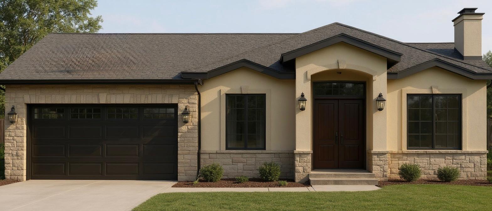 change the stucco paint to light or roman column by sherwin williams change the garage door to black change the entrance door ti a very light wood change the light fixtures to modern architecture