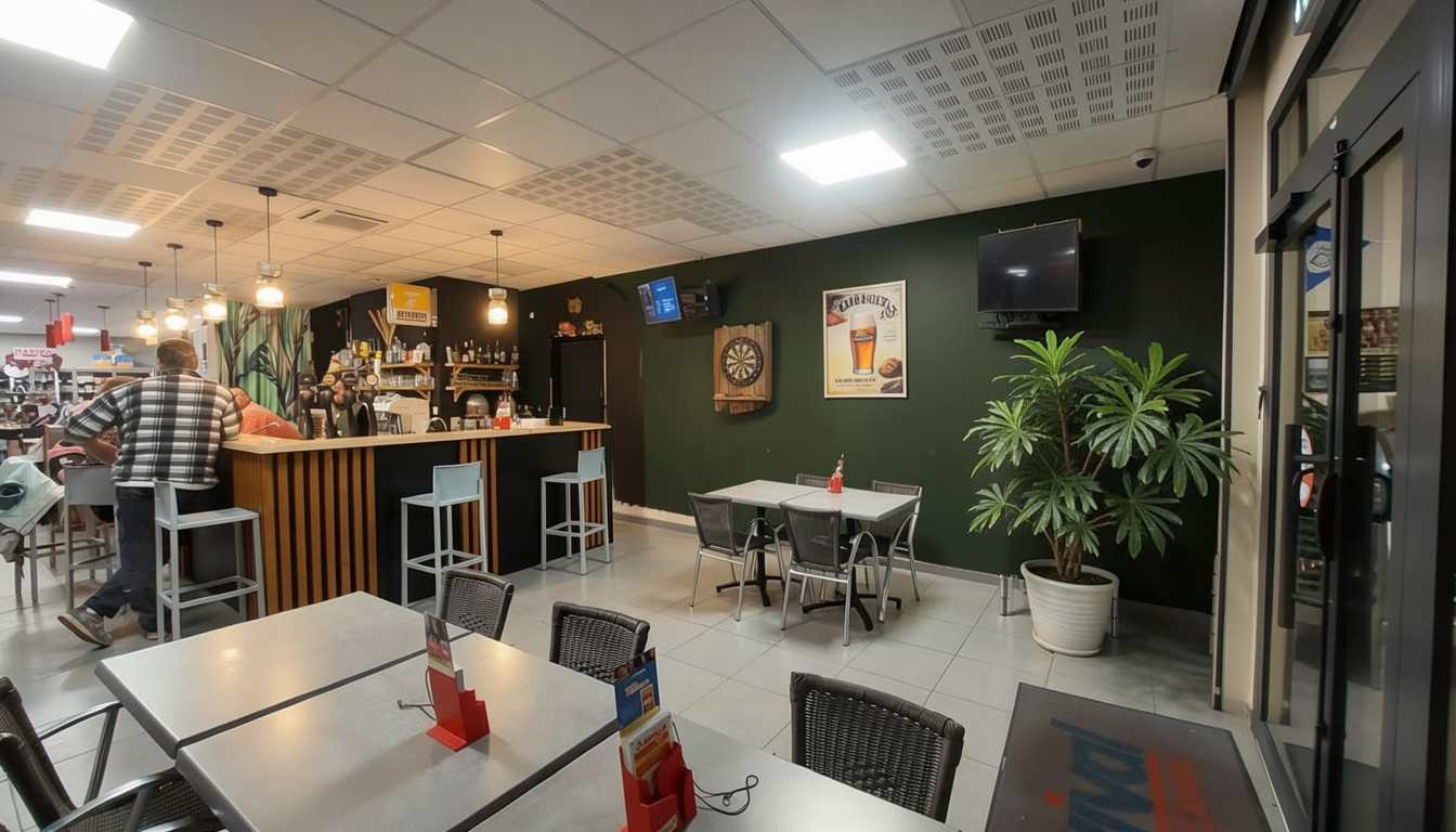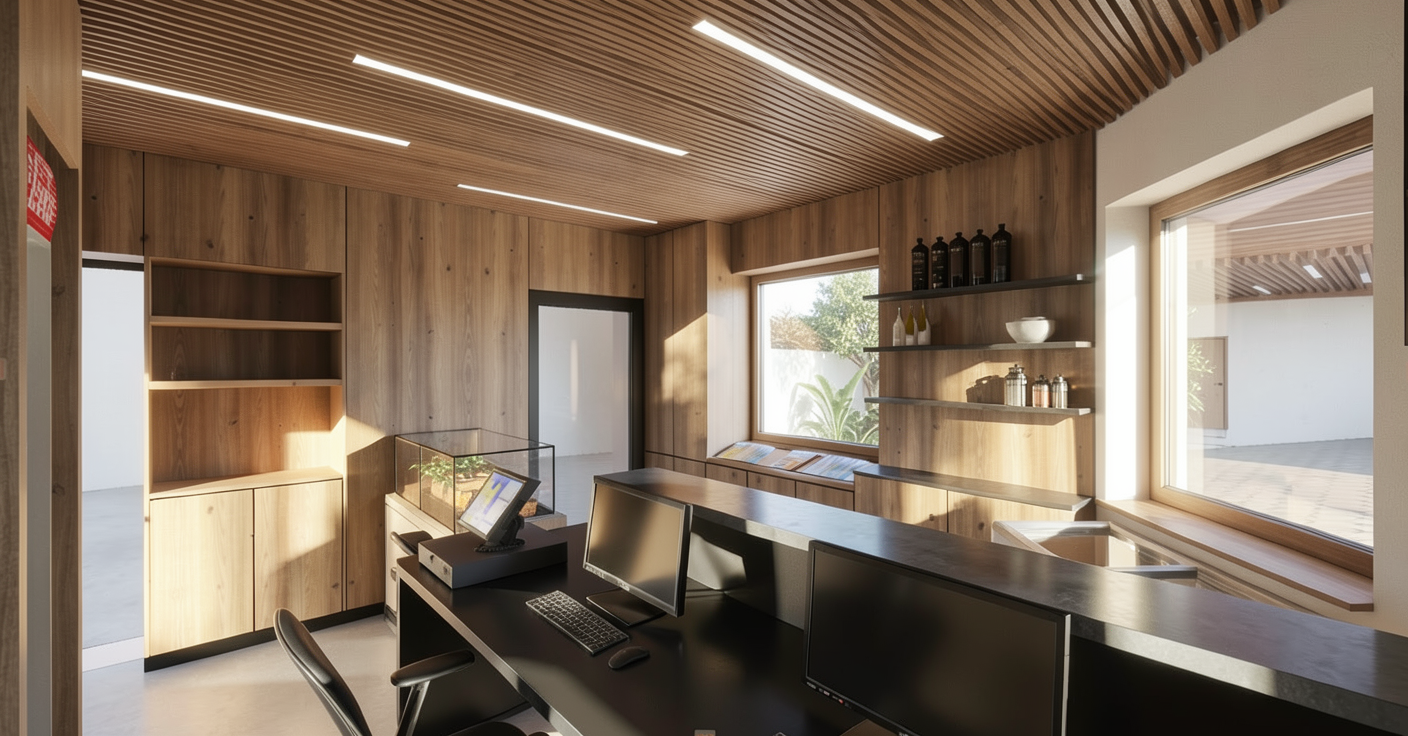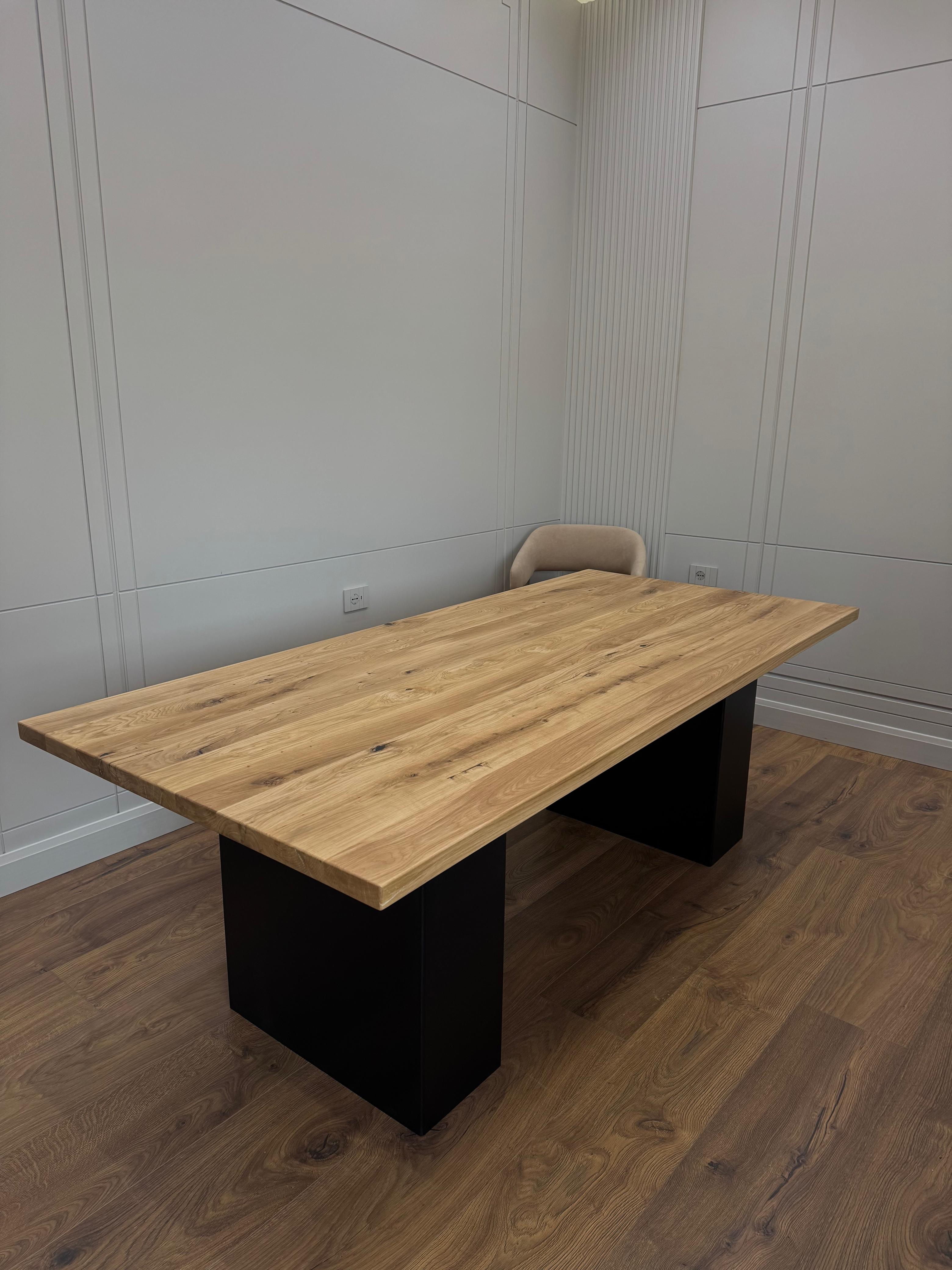 clean ultra realistic architectural interior of a minimalist dining space with soft beige arches warm indirect lighting natural oak wooden dining table with a matte black rectangular base preserve the exact table design and proportions improve lighting softness enhance material realism sharpen wood grain detail balanced exposure high end interior photography style luxury minimalism calm atmosphere no people no extra objects no decorations 4k photorealistic
