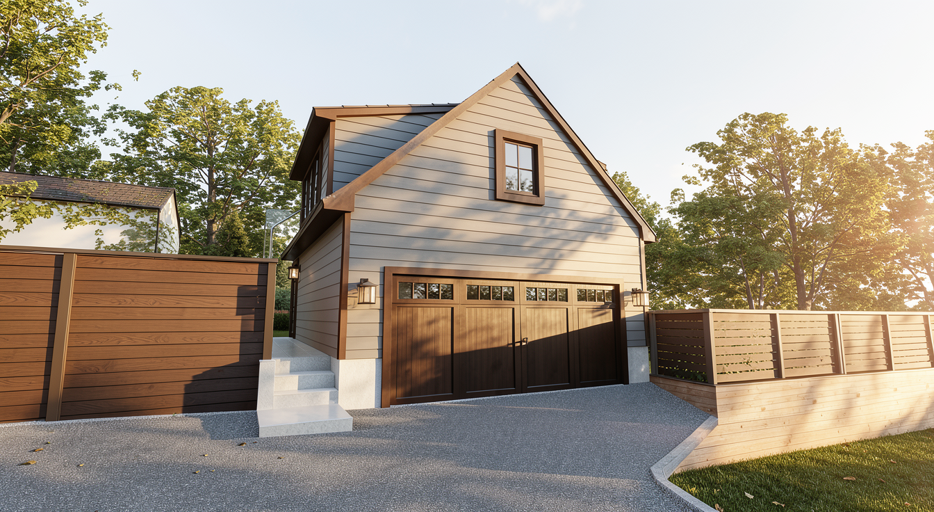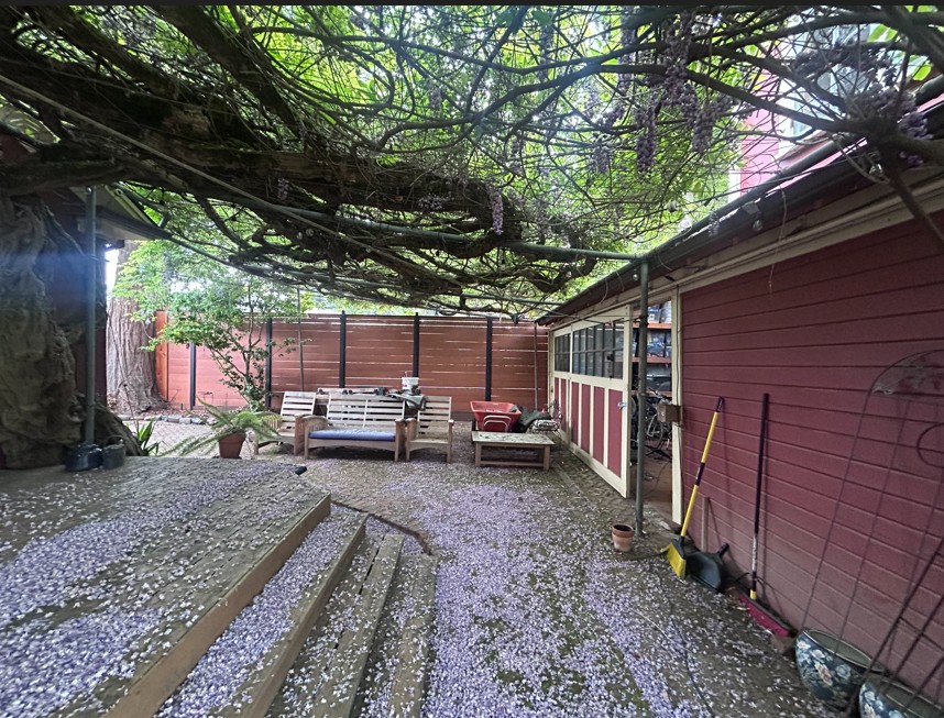 clean all wisteria trash and create a pergola that has posts attached to the left side and the right side will be supported on top of the roof of the other building wisteria will be on top of the wooden pergola
