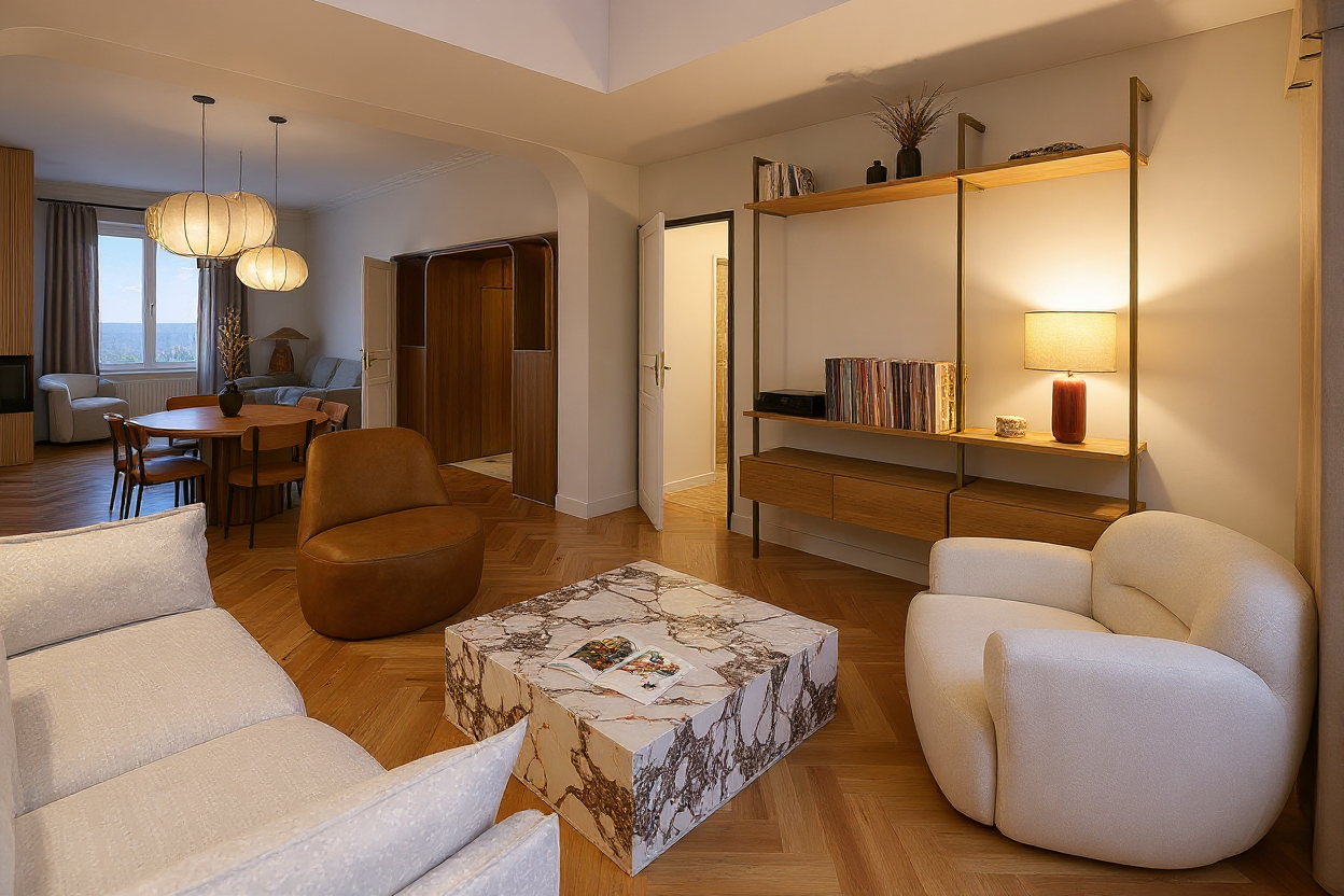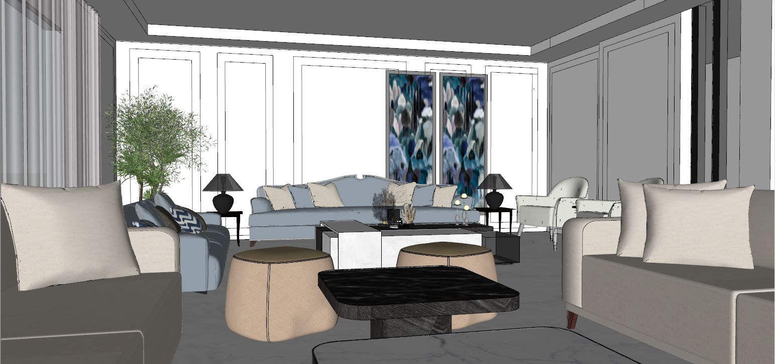 keep the colors as is dont change any material just same as the pic and the add light to the ceiling indirect and chandelier that fits the mood of the design crystal chandelier