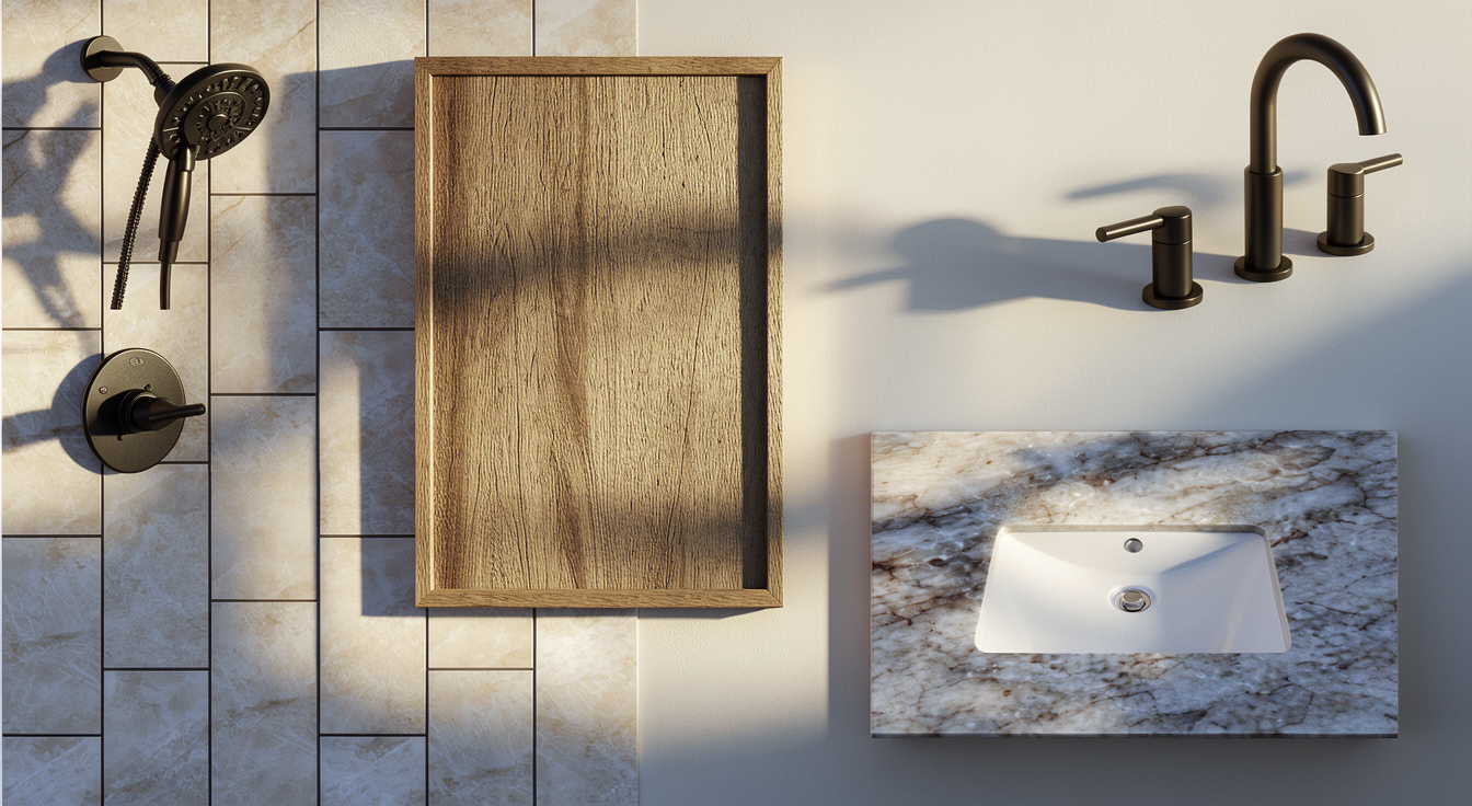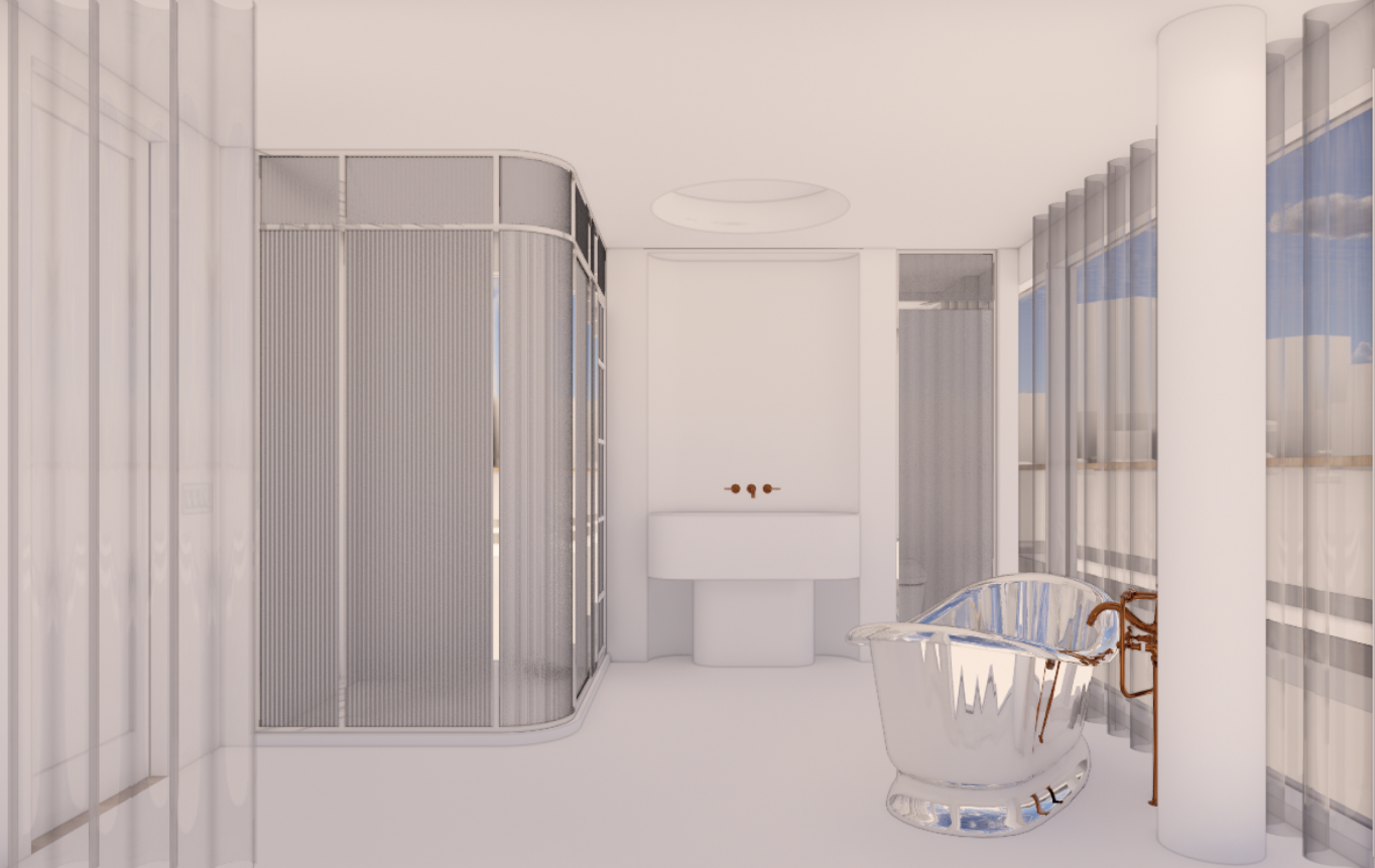make the floors sink and shower interior the marble in the attached sample make a metal pole coming out from behind the sink with a round mirror attached to the pole not the wall place the attached sconces on either side of the mirror walls and ceiling should be high gloss in the attached color sample