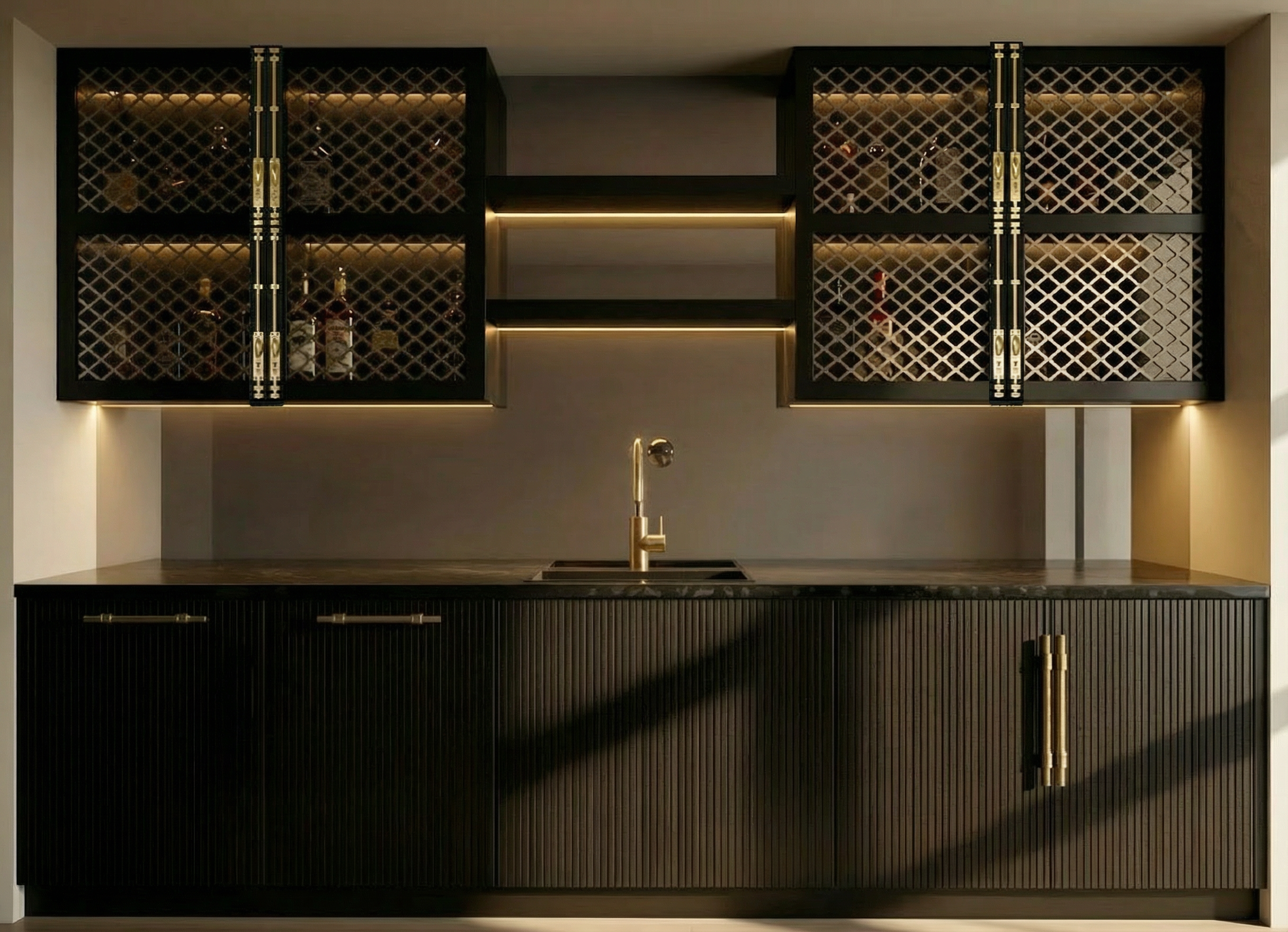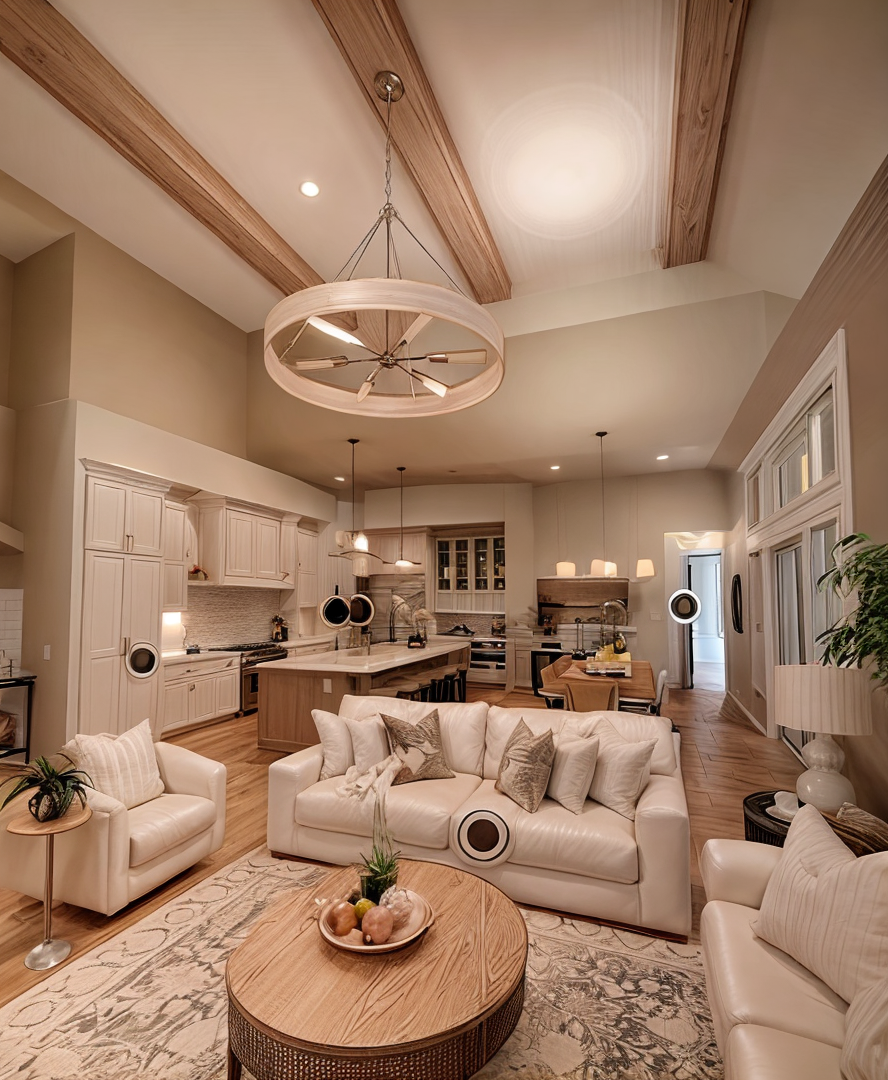change all cabinets on left and back wall to black add waterfall island countertop remove ceiling wood beams change chandelier change windows to black