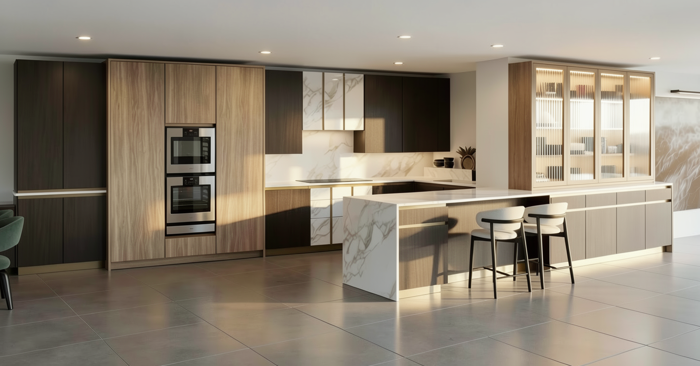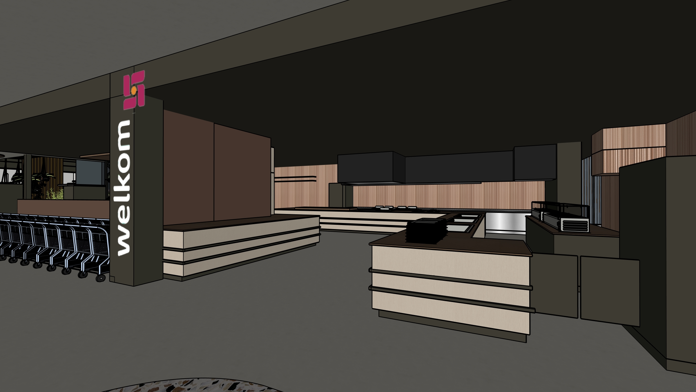 a photorealistic high resolution interior photograph captured in natural bright daylight based strictly on the layout and composition of the provided wireframe view there are absolutely no changes allowed to the design placement or proportions of the original composition no additional objects or displays are to be added the materiality of all elements must be photorealistically rendered flooring the foreground features a detailed patterned terrazzo surface with black white brown and pink stone fragments embedded in a pale creamy matrix walls structure basic walls all basic walls columns and the ceiling area of the kitchen space including the soffit are finished in a smooth matte coat of little greene attic 2 dark charcoal green ceiling beams the exposed beams and the rest of the ceiling are also finished in little greene attic 2 main walls all main walls including the sign column on the left which features the welkom vertical white text and pink magenta logo graphic are finished in little greene attic 2 kitchen back wall highly textured wallcovering with a granular neutral beige pattern vescom tonga 1082 12 kitchen area the entire kitchen service counter area is rendered with high fidelity fronts counter body features fronts in a fine linear textured pale wood grain laminate decolegno reflex fd06 with precise dark charcoal green painted edges little greene attic 2 countertop smooth highly polished dark brown natural stone with distinct rich veining and texture refinement focus on photorealistic details texture definition for all materials wood grain granular wallcovering polished stone accurate light behavior and realistic reflections in the stone and other surfaces maintain the exact spatial arrangement natural daylight from the left must be dominant strict directive render the scene exactly as shown in the wireframe of the visual preserving all proportions and design elements but with photorealistic materiality and lighting do not add or subtract elements omit added objects