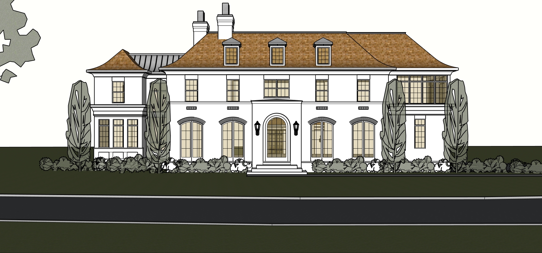 use reference for lighting and materials roof to be cedar shake roof use reference photo for background and landscaping