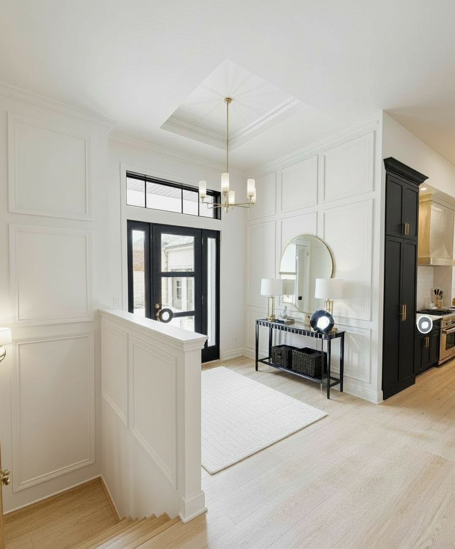put picture frame molding on both walls make the window above the door black vinyl