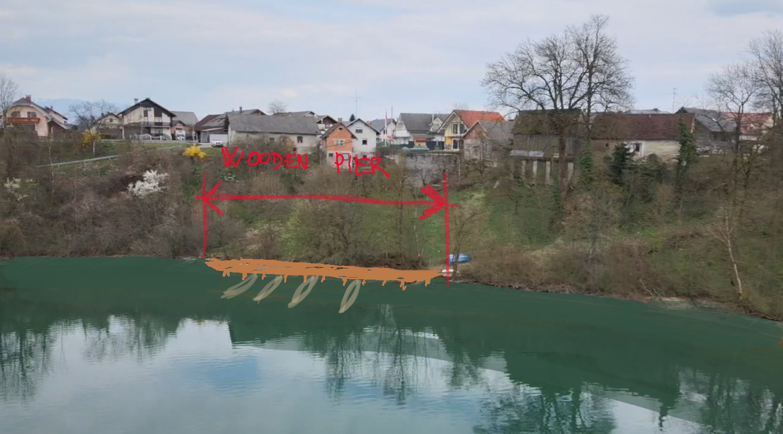 crate visualisation of the sketched parts of the image keep the viewpoint and terrain as it is in light brown color is drawn wooden pontoon pier along the riverside entrance to the pier is on the left and on the right side the position and length of the pier is marked on the picture there are some small boats in front of pier add some people on the pier